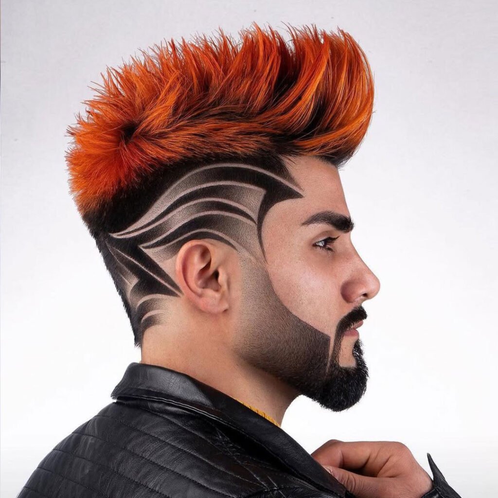 The spiked faux hawk is an attention-grabbing hairstyle characterised by upward spikes along the centre strip of the head. Enhanced with intricate hair tattoo designs on the sides, this haircut becomes a true work of art.