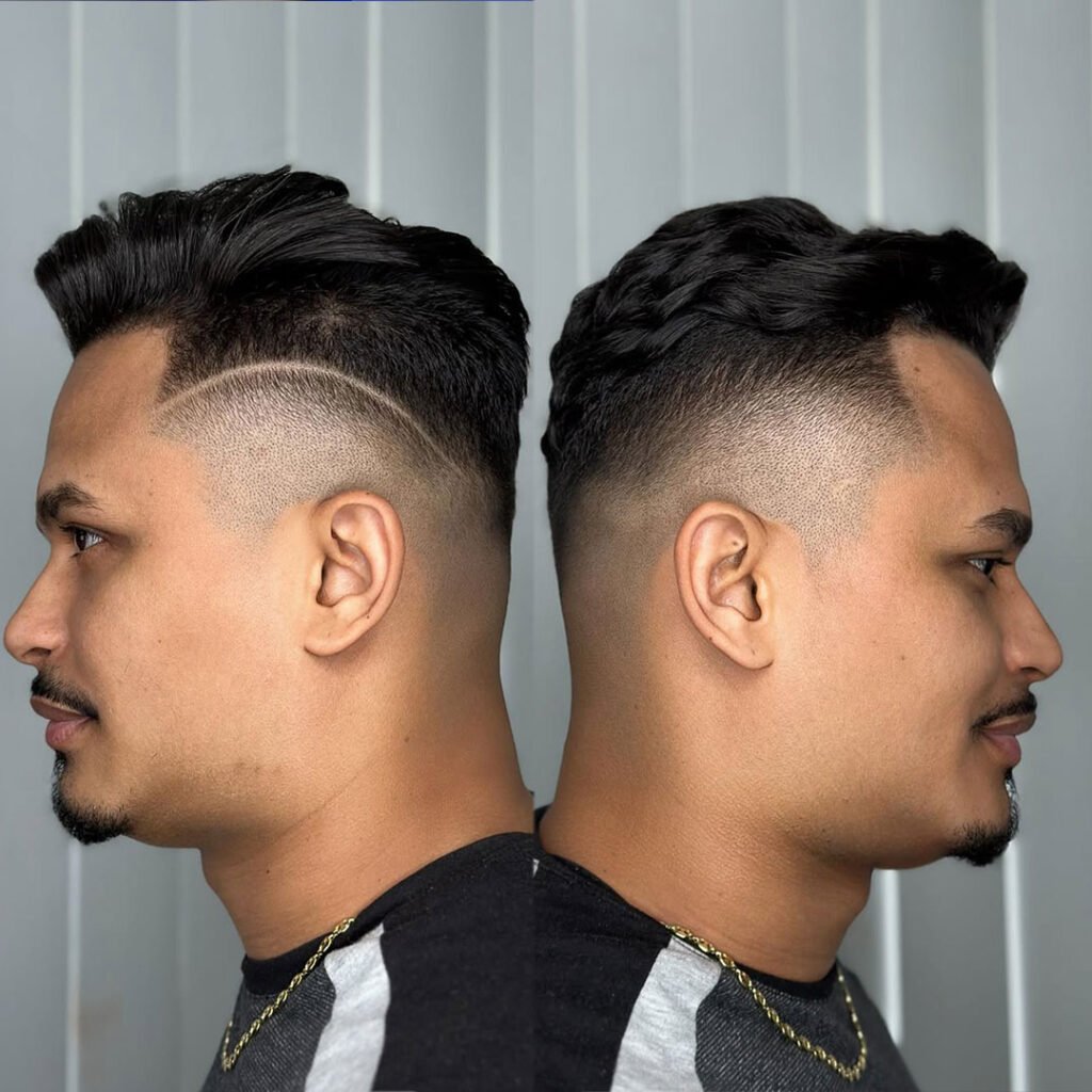 This style is ideal for men who want a unique blend of classic sophistication and contemporary artistry. The sharp fade contrasts beautifully with the high-volume top, emphasising structure and creativity. Hair designs add personality and flair, making each haircut a statement piece.
