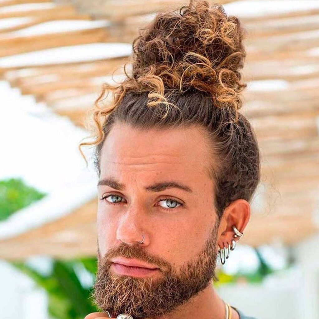 The curly top knot with undercut blends practicality with style. Long curly hair is tied into a man bun at the crown, while the undercut keeps the sides clean and cool.