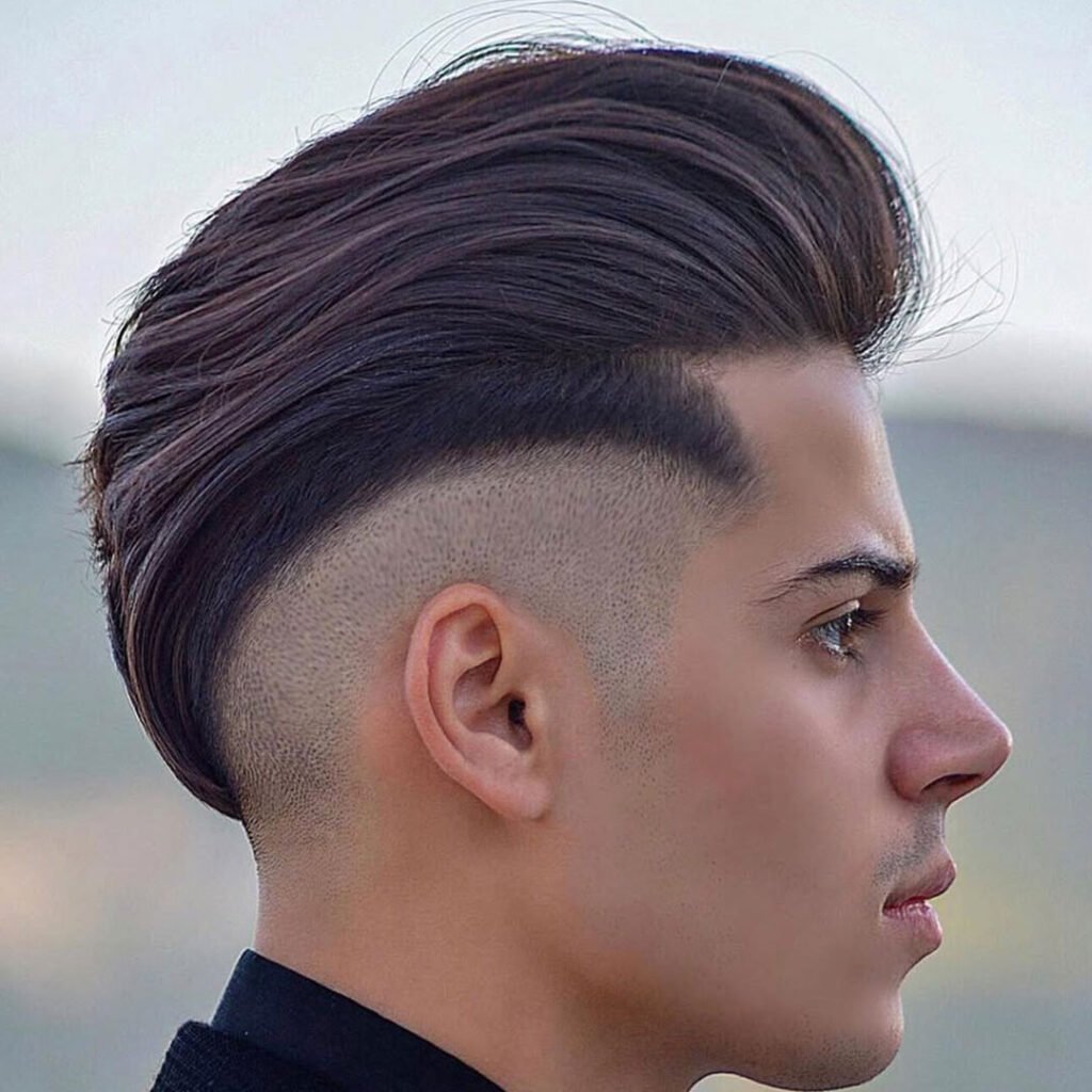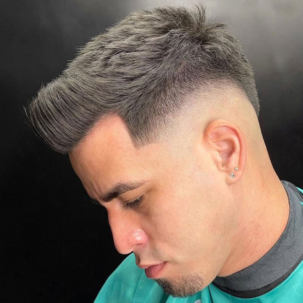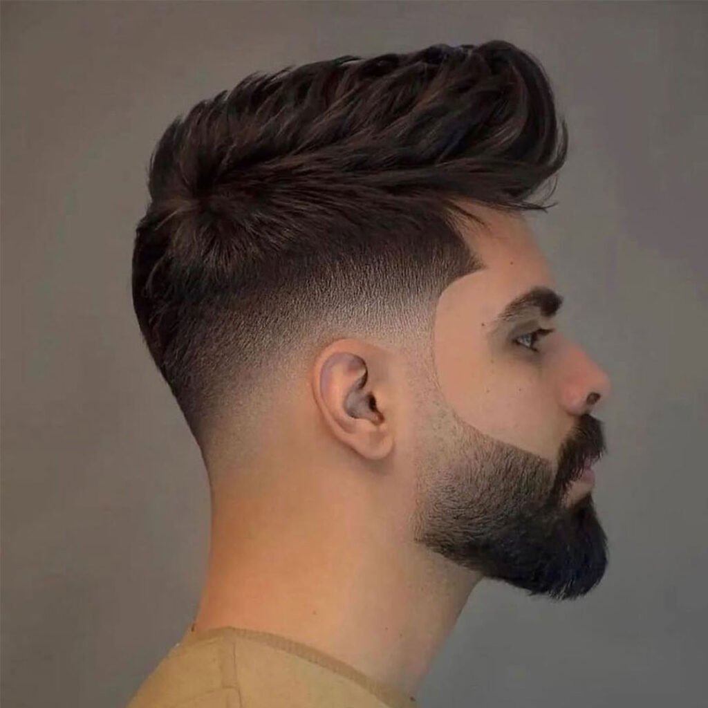 The voluminous pompadour with low skin fade combines vintage flair with modern sharpness. The top is styled high with volume and swept back smoothly, creating an eye-catching silhouette. The low skin fade on the sides sharply contrasts with the elevated top, emphasising the haircut’s bold shape.