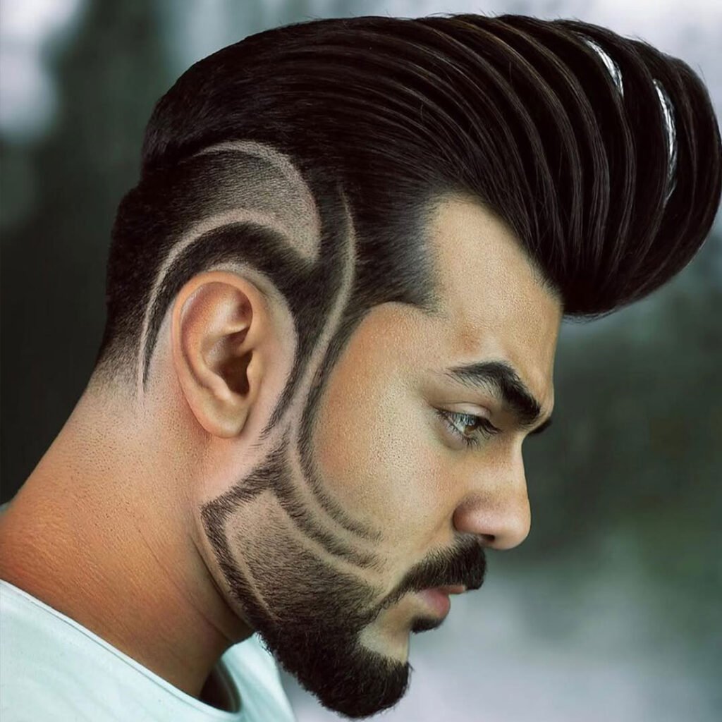 The sculpted pompadour with artistic hair design elevates the traditional pompadour by integrating creative, precise hair art. The top is volumised and swept back, while the sides feature a fade with intricate designs etched into the hair.