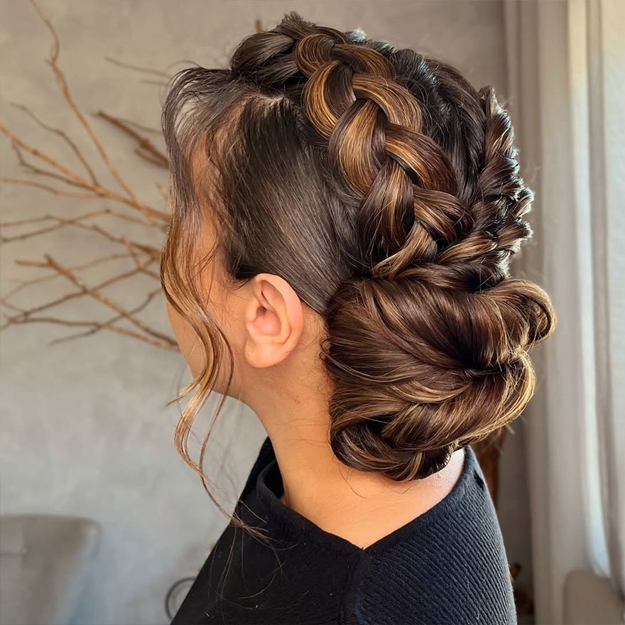 The Braided Voluminous Updo is a celebration of texture and lift. Multiple braids merge into a soft, voluminous bun that feels both powerful and graceful. It’s the ideal choice for someone who wants height, structure, and a dose of drama.