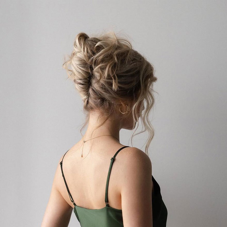 The Braided Messy Updo combines bohemian beauty with intricate detail. Loose braids intertwined into a relaxed bun create stunning texture and visual interest. This look is both charming and functional, staying secure while looking effortless.