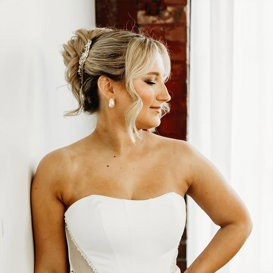 The Romantic Bridal Messy Updo is soft, timeless, and perfect for brides who love understated elegance. Loose waves and airy twists create a dreamy silhouette that flatters every face shape and complements both veils and floral crowns beautifully.