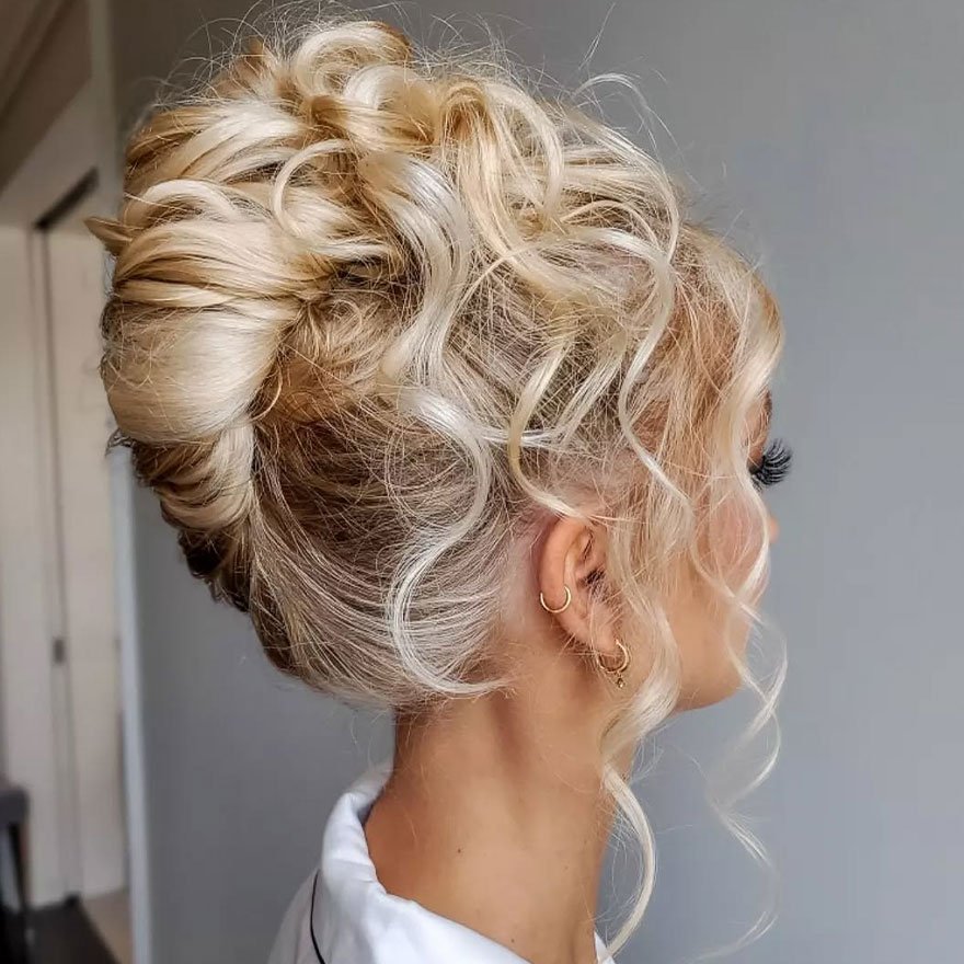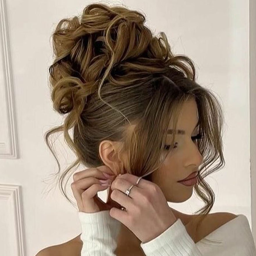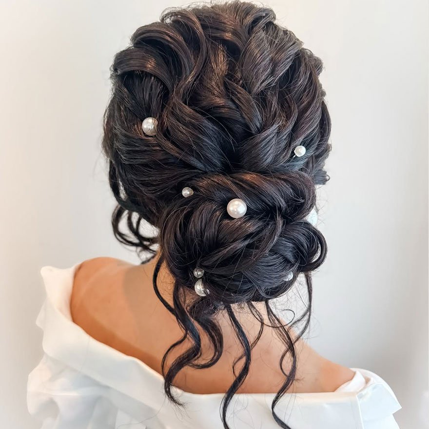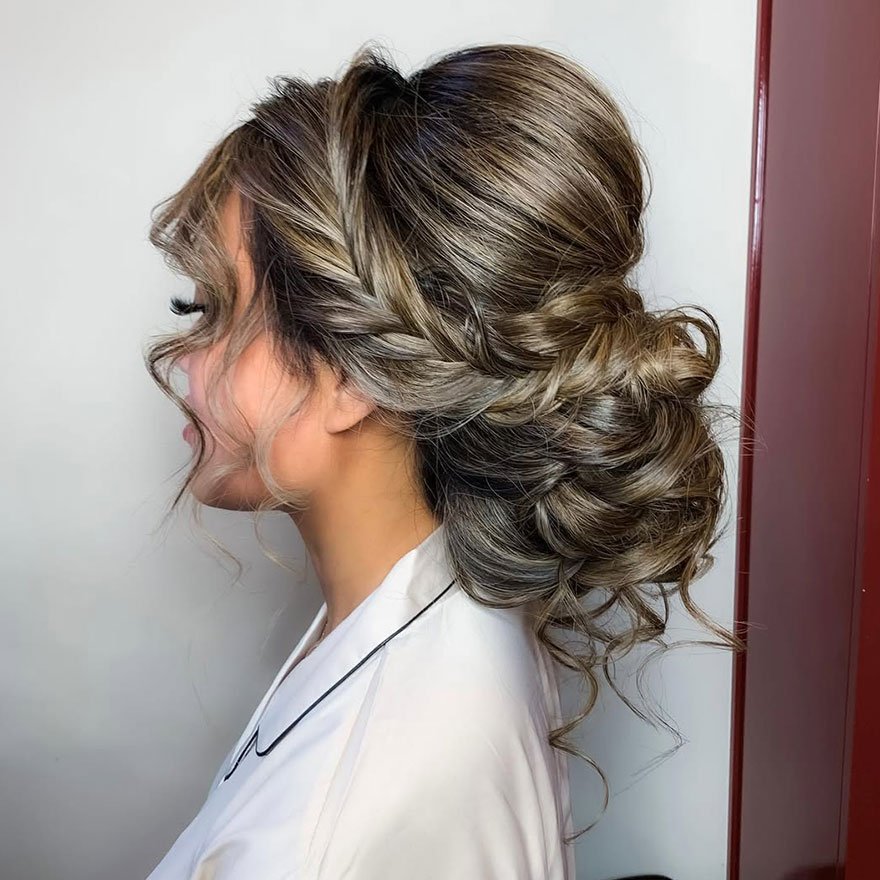 The Braided Textured Bun with Loose Curls is a true masterpiece for those who love volume and intricacy. Braids flow into a softly curled bun, adding balance between structure and playfulness. It’s perfect for bridesmaids or formal evening events.