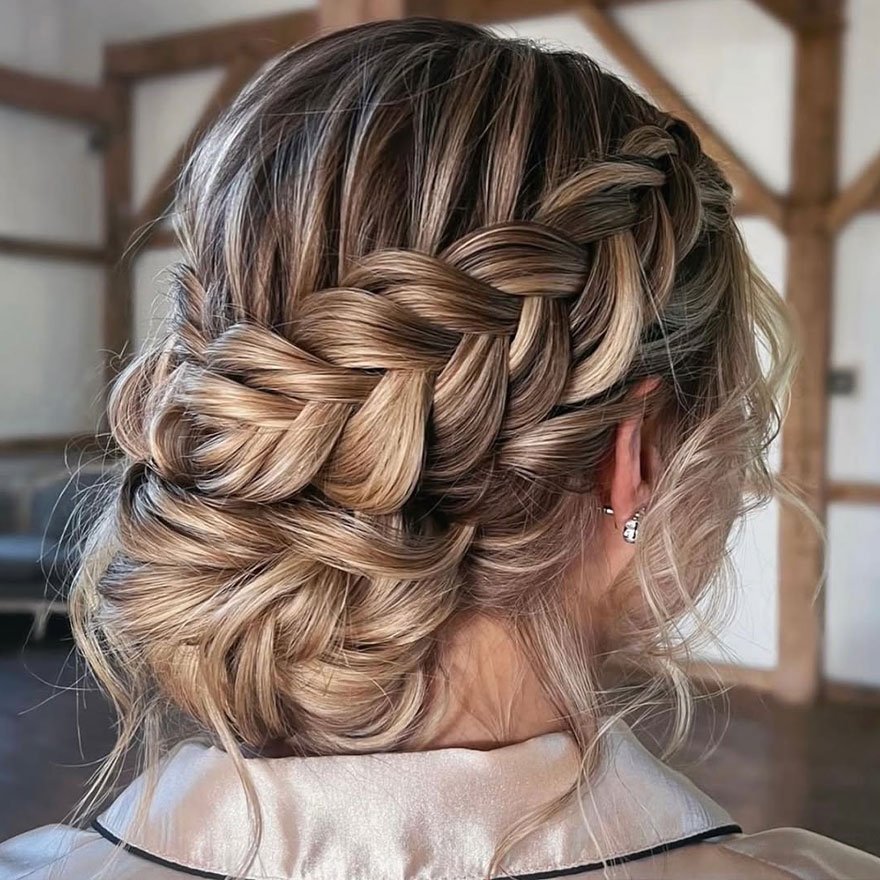 I tried this on my sister-in-law for a garden wedding, and it was a complete hit. The braid framed her face softly, and the undone finish gave her a radiant, natural glow. This updo truly captures the spirit of free-spirited sophistication.