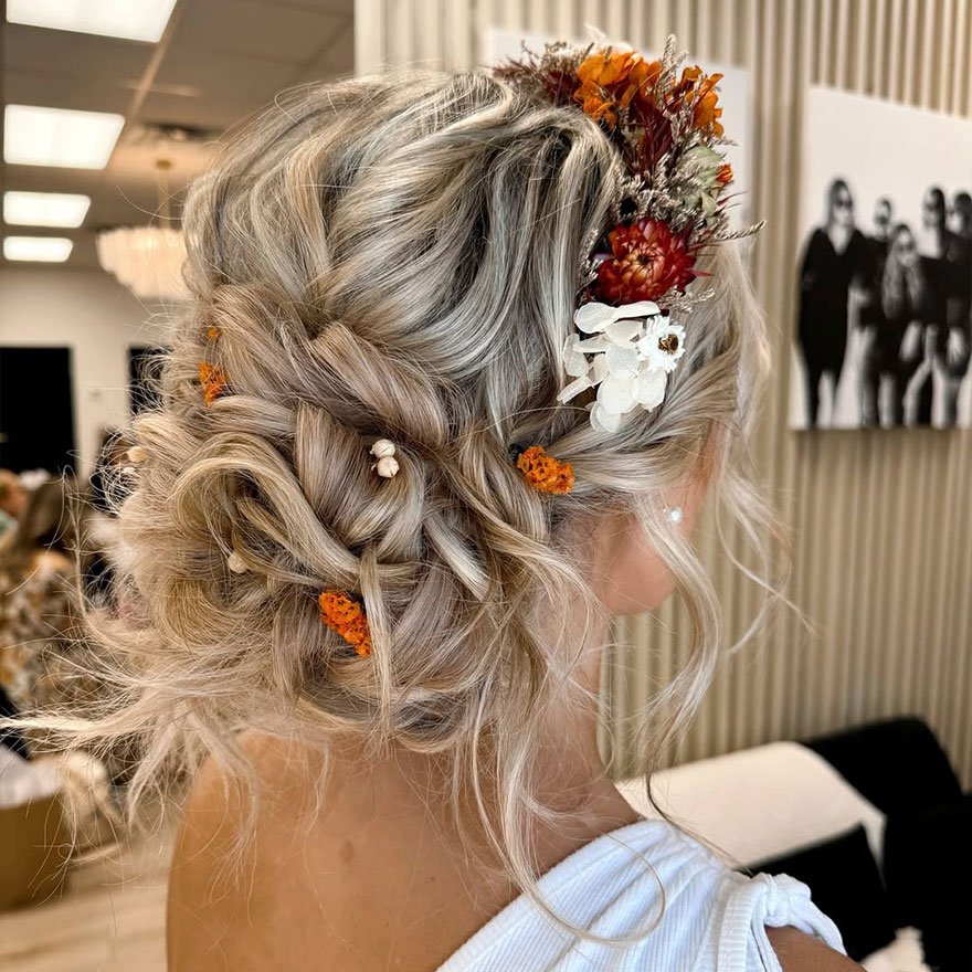 The Floral Boho Messy Updo captures the essence of free-spirited femininity. Loosely twisted sections blend with small braids, finished with fresh or faux blooms for a soft, romantic finish. It’s ideal for outdoor weddings, festivals, or beach photoshoots.