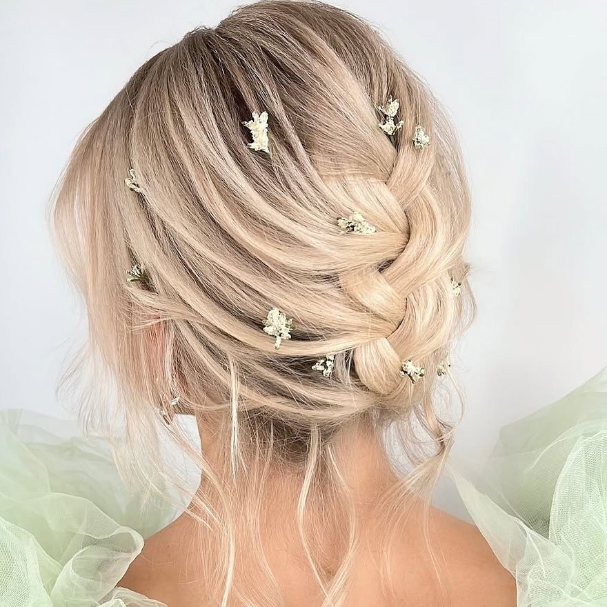 The Soft Braided Low Updo radiates quiet elegance. Loose braids wrap gently into a bun, and delicate baby’s breath pins add a subtle romantic touch. It’s a style that’s both classic and modern — perfect for bridal or special event looks.