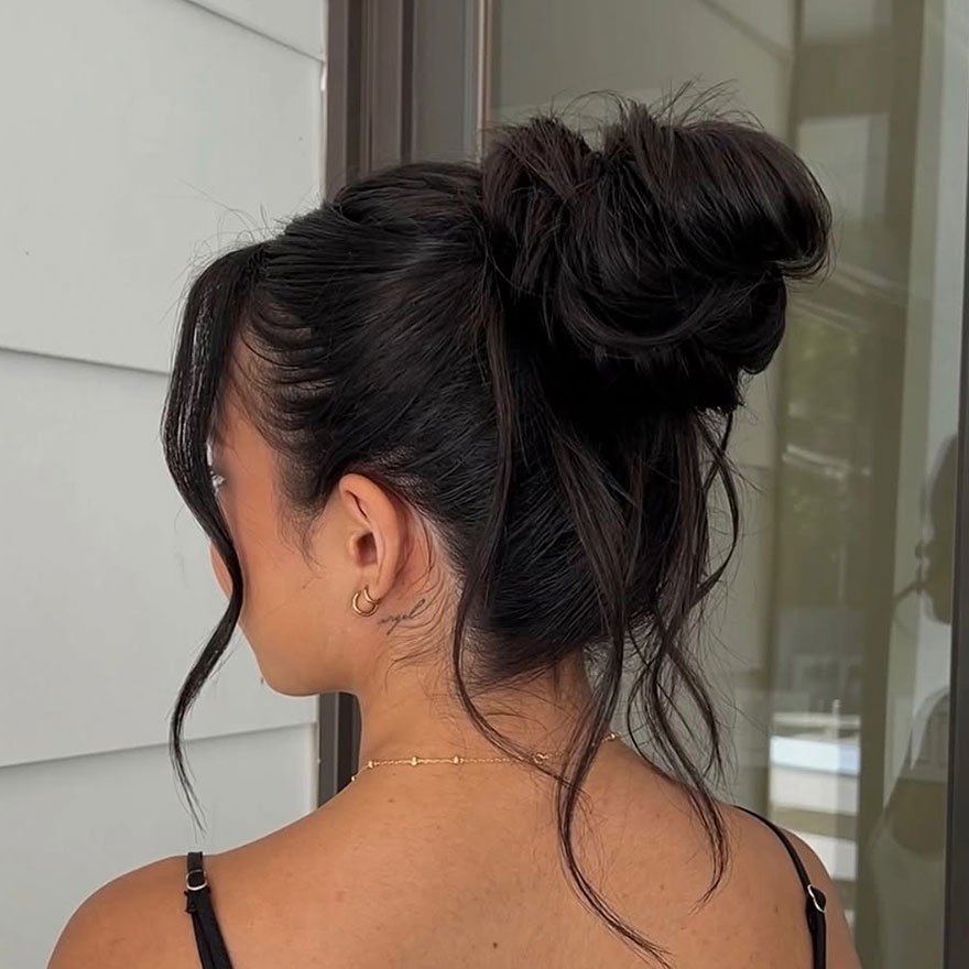 What makes this bun stand out is how effortlessly it balances polish and playfulness. Choose a scrunchie in a contrasting color or soft silk fabric to add personality and volume. A few loose strands around the face enhance the dreamy, laid-back charm that defines the messy-updo aesthetic.
