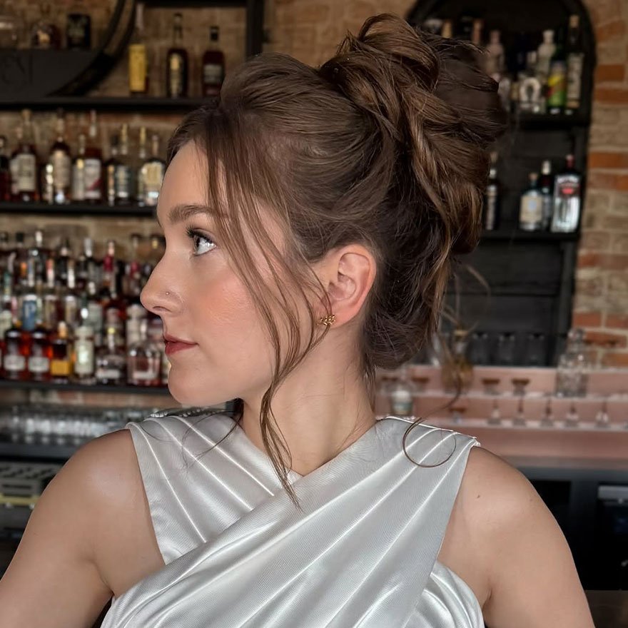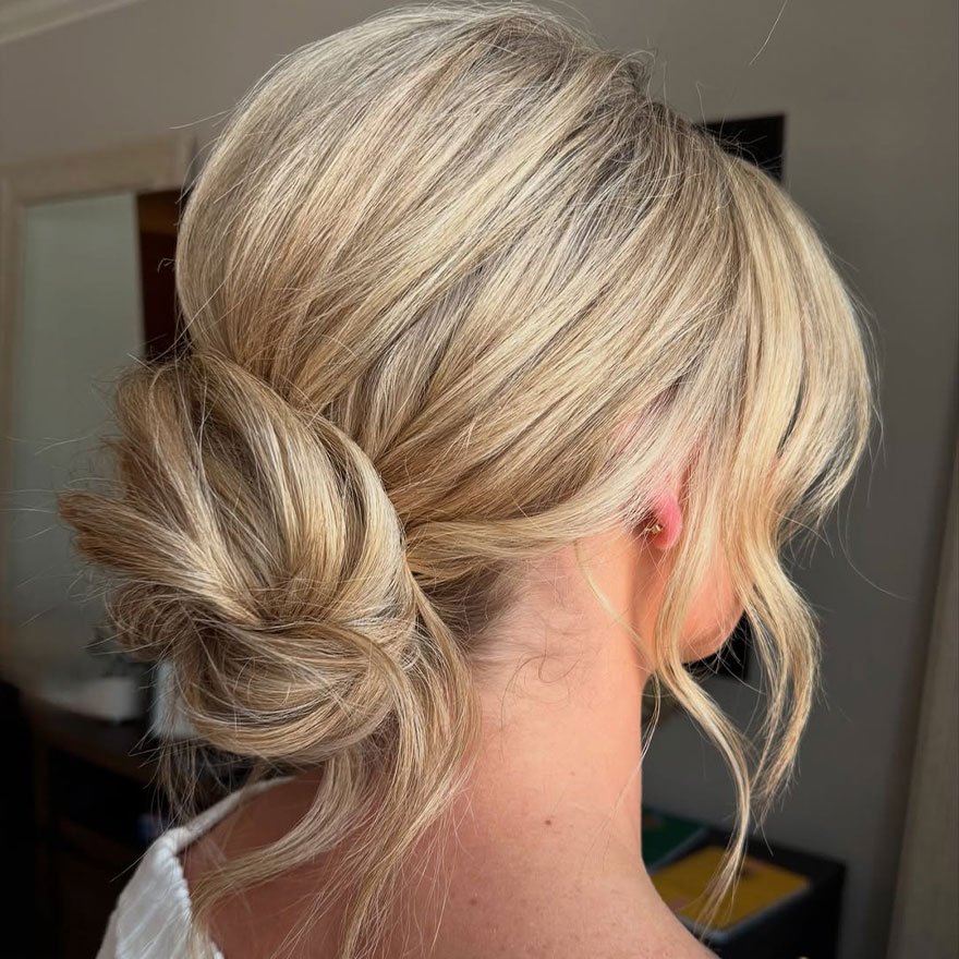 The Tousled Romantic Bun brings a graceful balance of texture and tenderness. It’s a style that suits every face shape and gives off a naturally soft glow. The bun sits low with delicate strands falling loosely, offering that perfect “just styled but not overdone” impression.