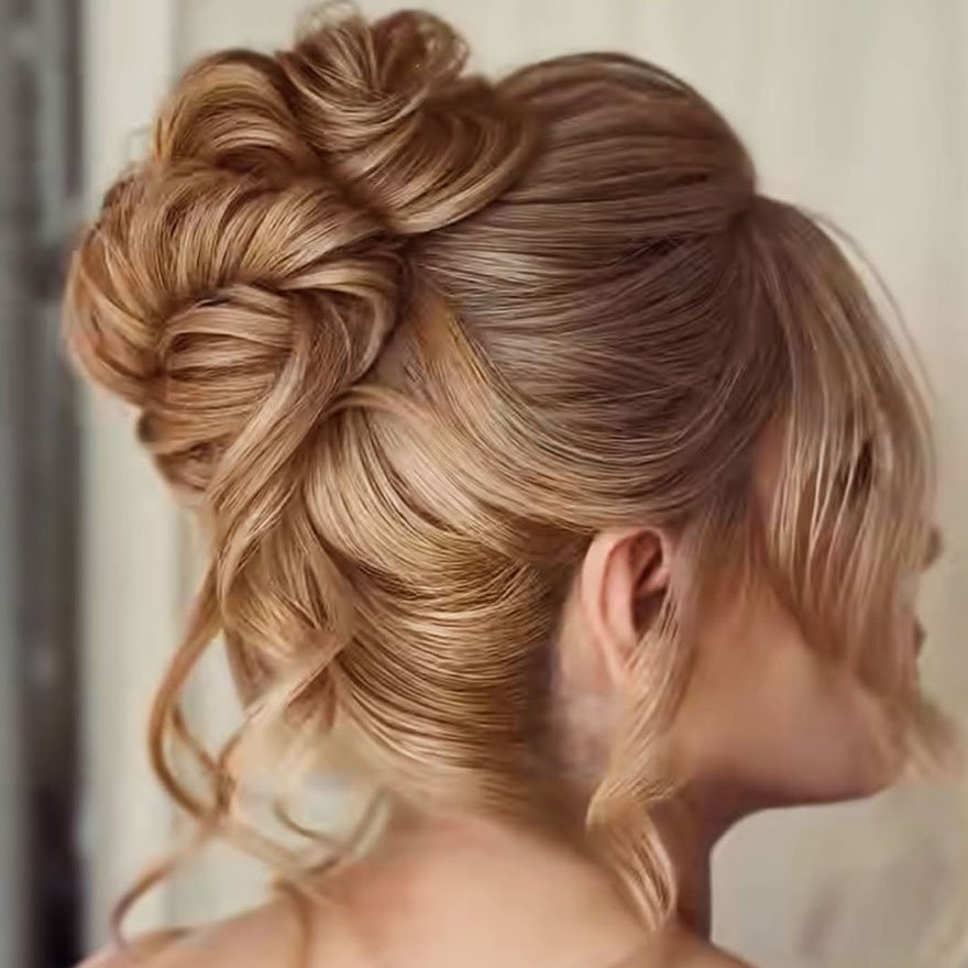 The Textured Voluminous Updo is all about big, soft dimension. It combines airy teasing and gentle curls to create a full, glamorous shape that’s still relaxed and touchable. This look is perfect for special events or even editorial shoots that need a bold, romantic edge.