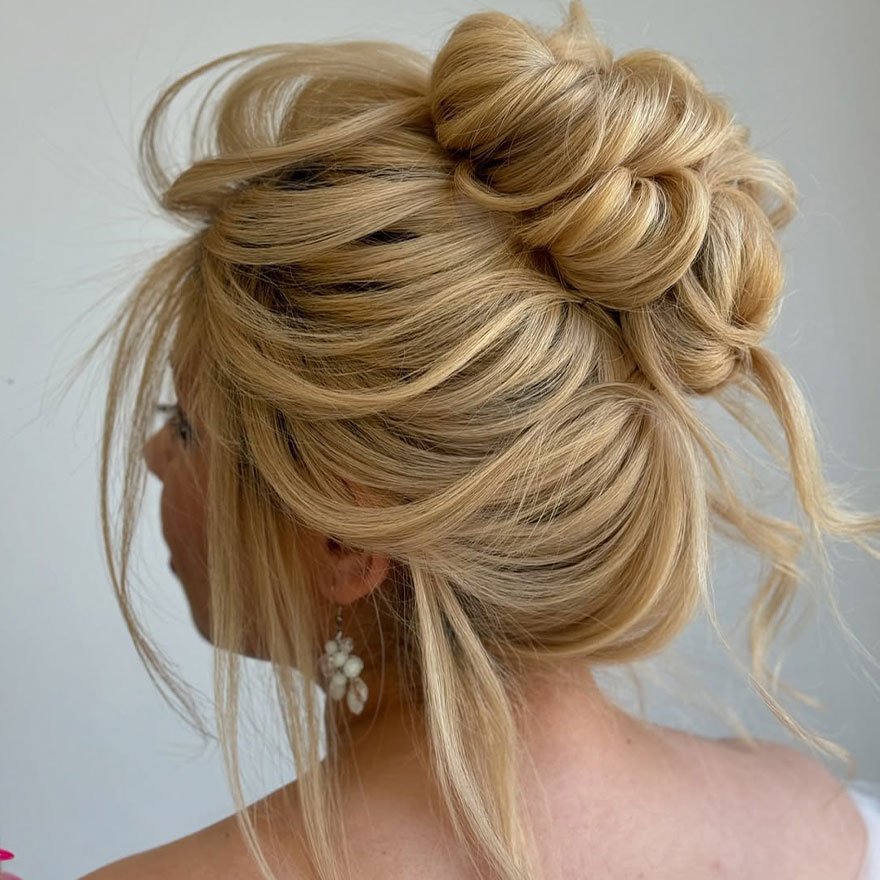 Messy updos flatter all face shapes. Adjust volume and placement — higher buns elongate round faces, while side buns soften angular ones.