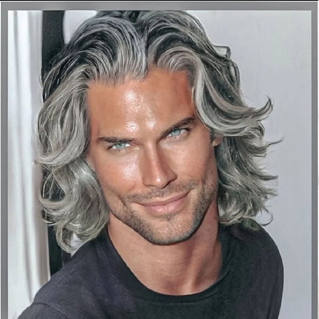 The wavy shoulder-length flow with silver highlights offers a striking modern look that combines texture with a pop of color. The waves give the hair natural volume and movement, while the shoulder-length cut is both versatile and easy to manage.
