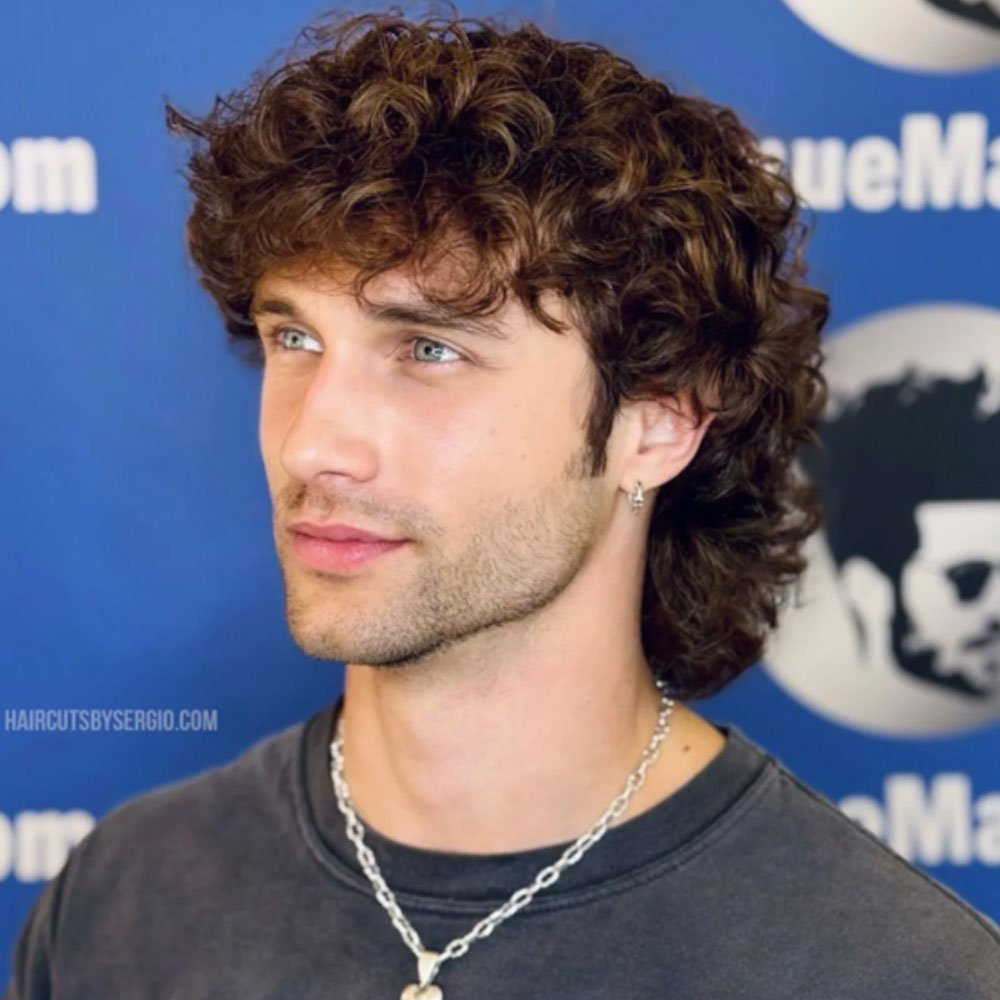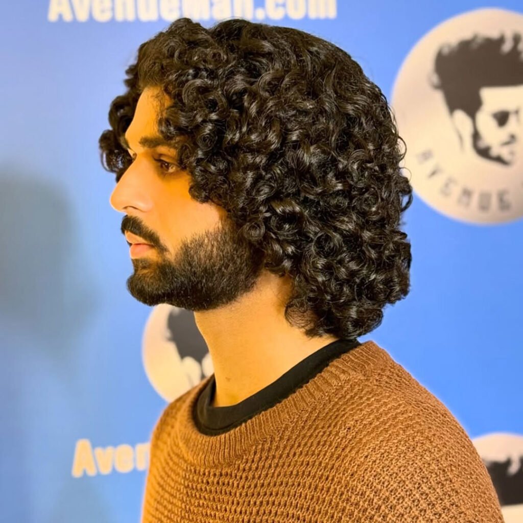 The medium-length haircut for men’s curly hair is designed to enhance and define natural curls while providing structure and shape.