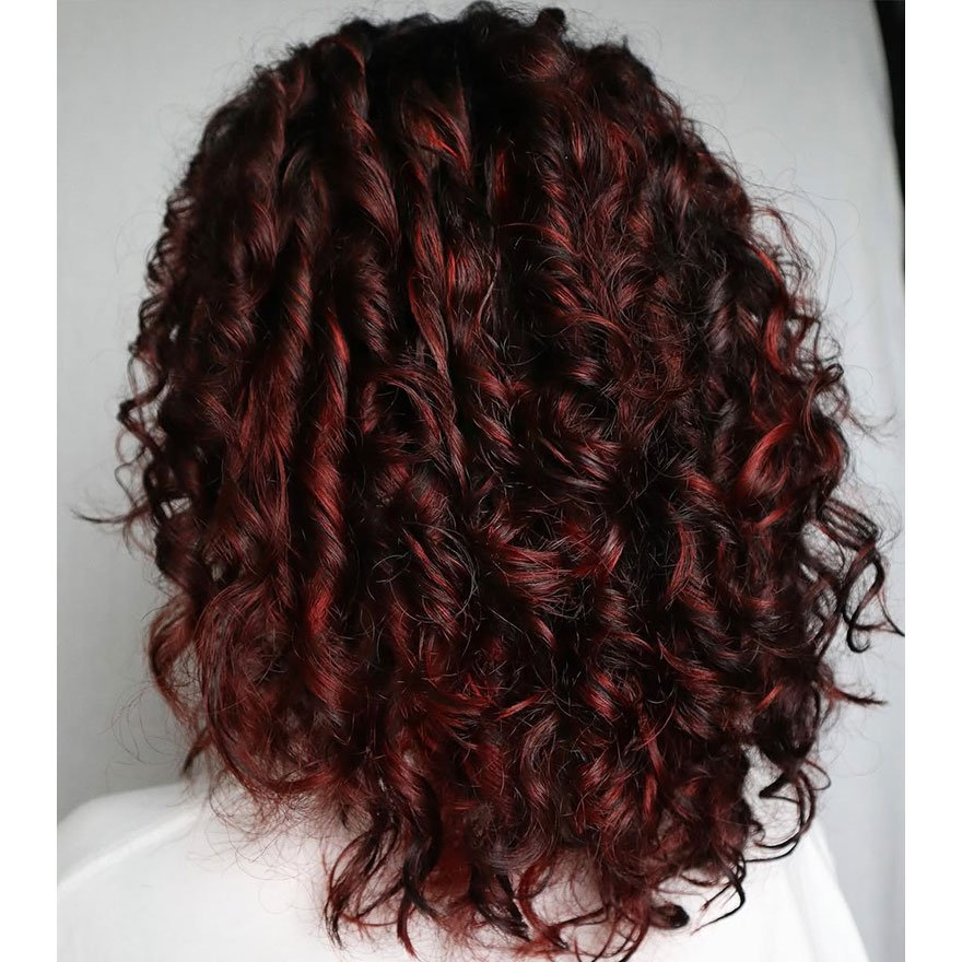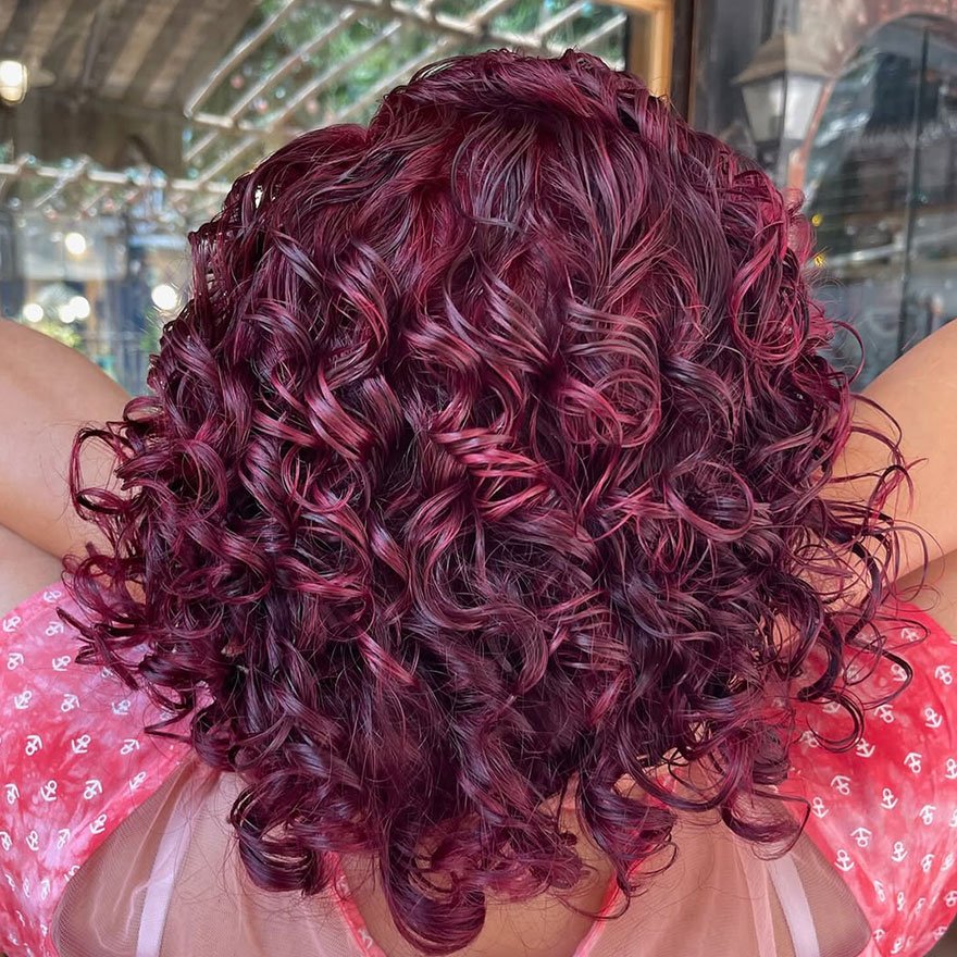 Dark ruby curls give hair a rich jewel-toned sheen that’s both dramatic and elegant. The curls enhance the depth of the color, making every strand shimmer like velvet.