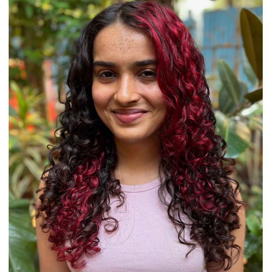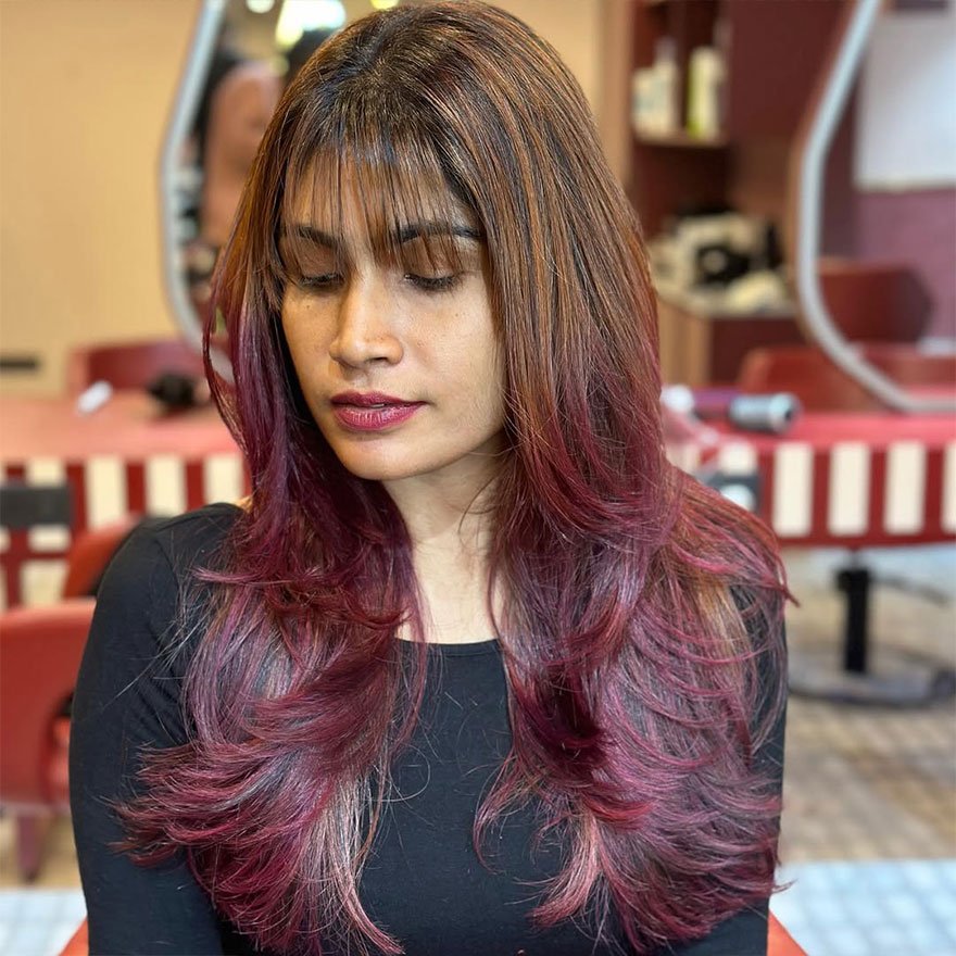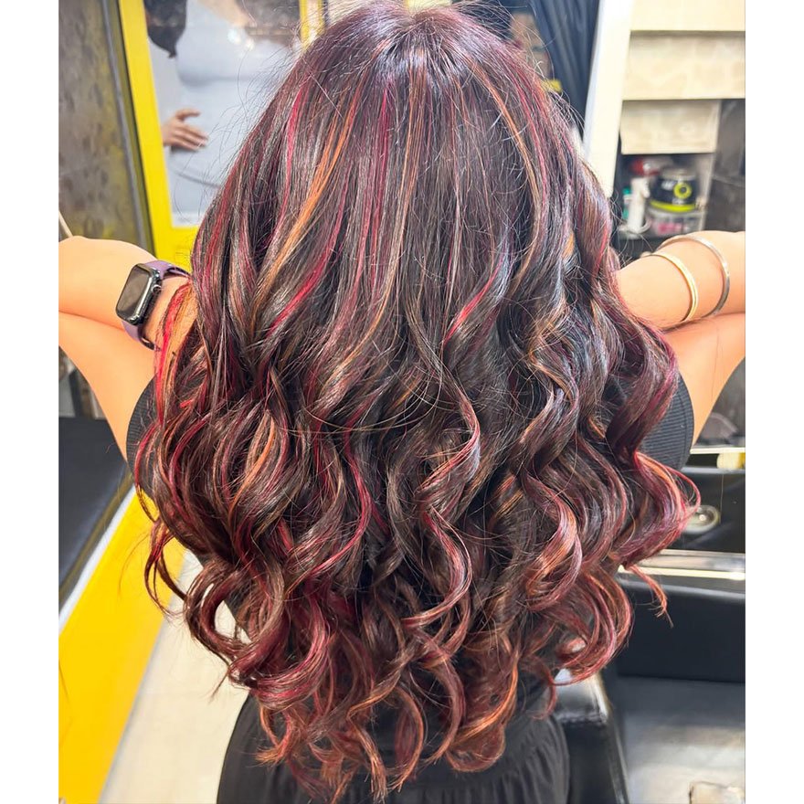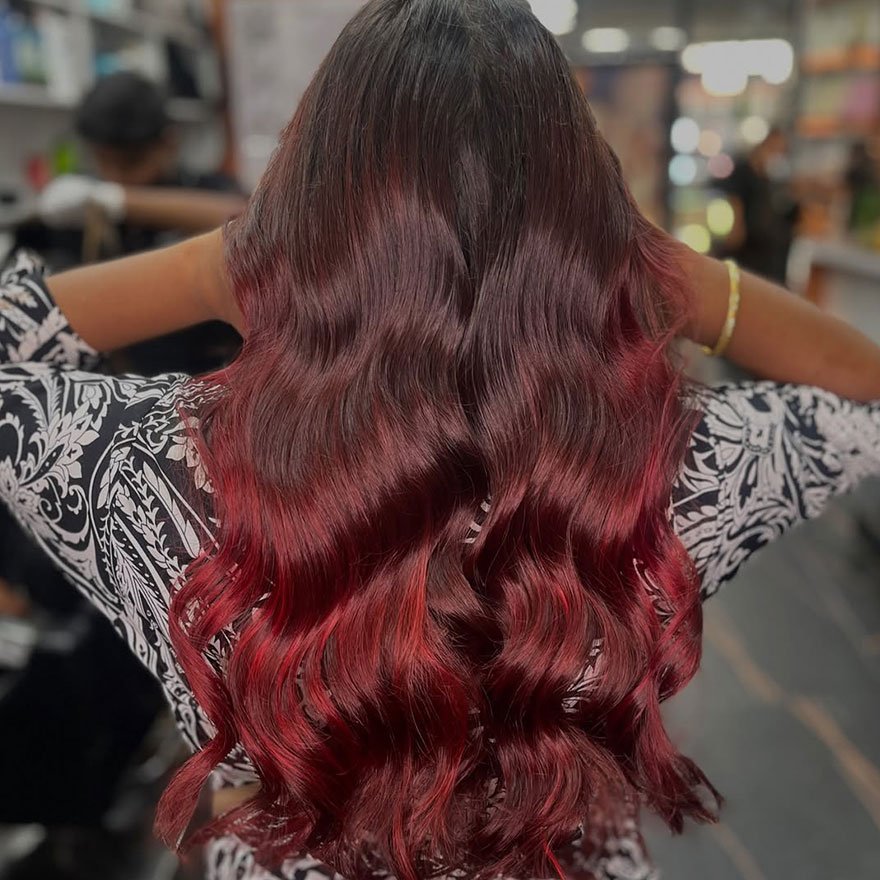 I created this look for my younger sister before her college farewell, and she told me she couldn’t stop running her fingers through it. Under the party lights, her hair shimmered like liquid ruby — it truly made her stand out.