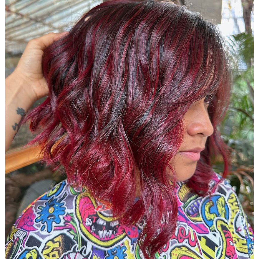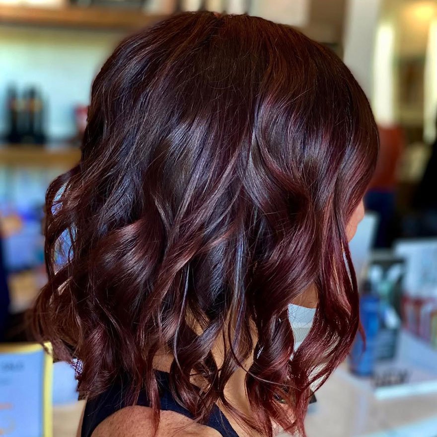The cranberry textured bob mixes bold berry color with choppy layers for a modern, lightweight cut. The texture gives volume and bounce, while the length keeps it easy to manage.