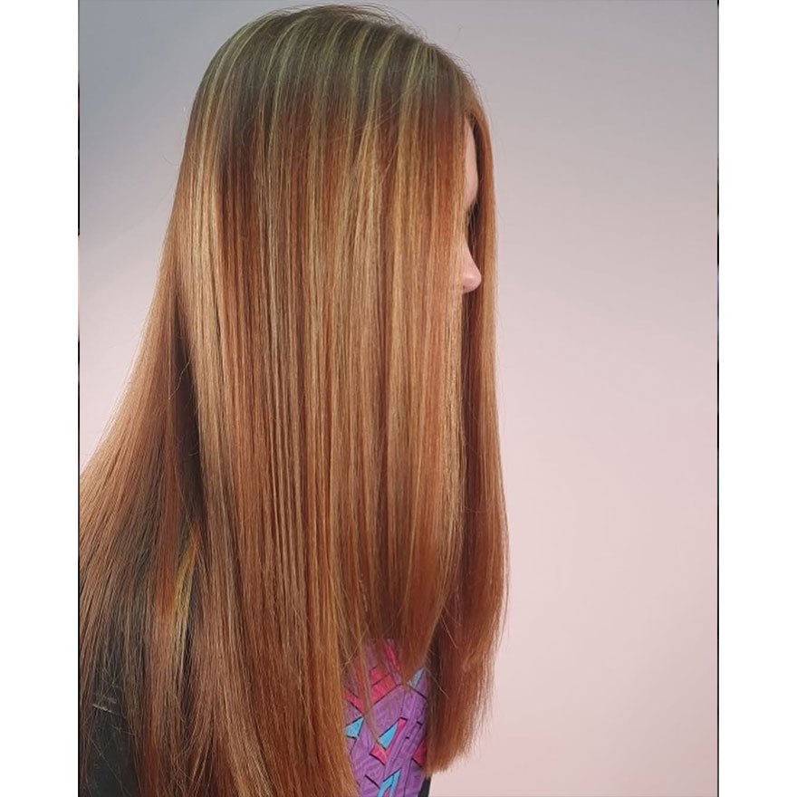 Golden auburn sleekness gives hair a polished, high-shine finish with warm golden undertones. It’s sleek, straight, and runway-ready.