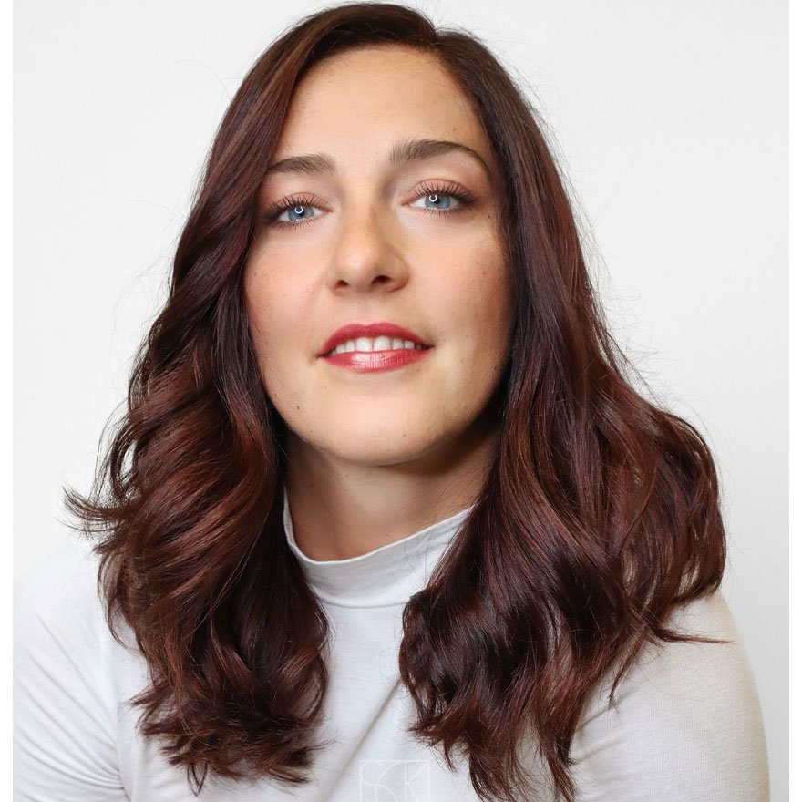 Soft mahogany curls combine rich brown-red tones with airy, voluminous curls for a dreamy, romantic finish. The color adds depth while the curls frame the face beautifully.