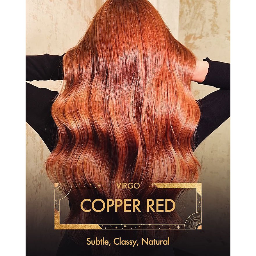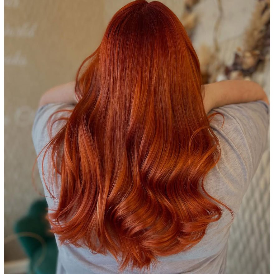 This classic auburn glow gives the hair a warm, fiery radiance that flatters every skin tone. It adds a smooth, even wash of color with a glossy finish that reflects light beautifully, making strands look instantly healthier and thicker.