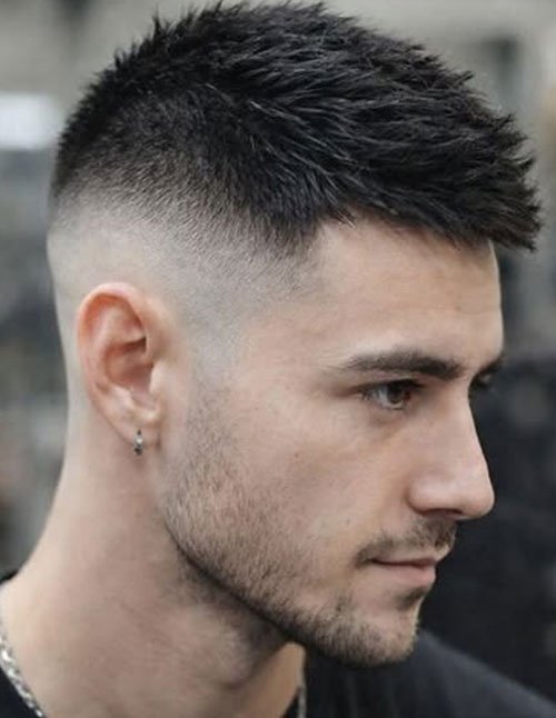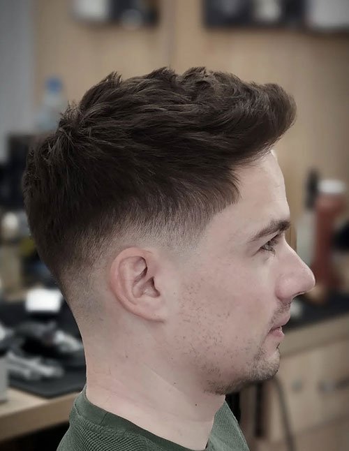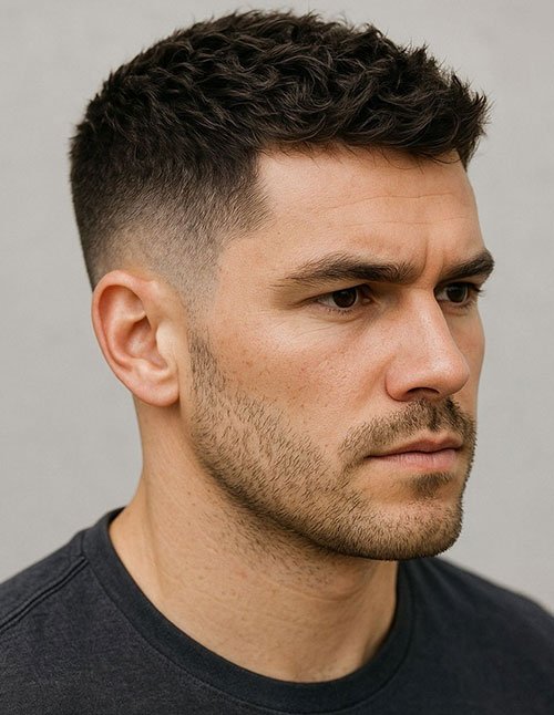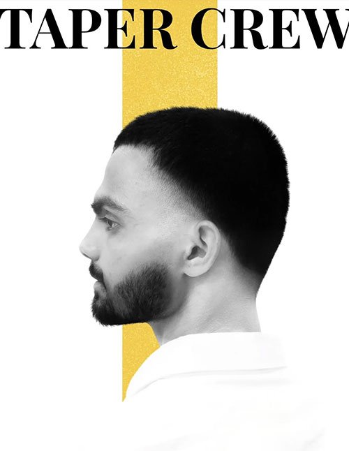 Simple, clean, and understated, the crew cut fade combines practicality with style. Low-maintenance and suited for nearly all face shapes, it keeps sides tapered while leaving slightly longer hair on top. Minimal styling is needed; a touch of matte product is optional.