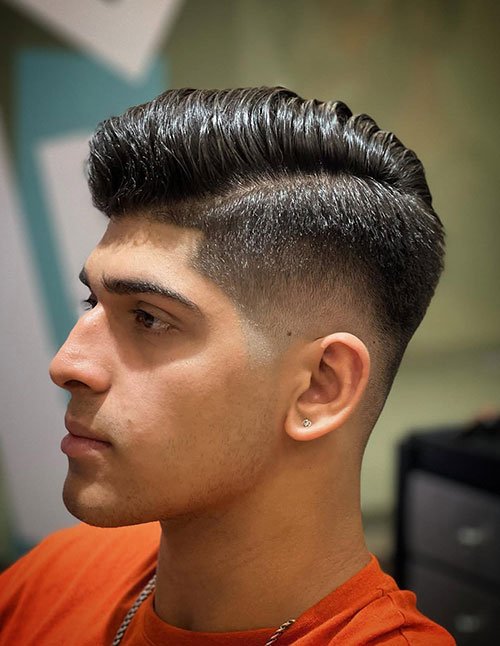 Bold and dramatic, the faded pompadour brings height and structure to the forefront. Ideal for thick or wavy hair and angular face shapes, it requires medium to high styling effort: blow-dry, brush into place, and set with medium-shine pomade.