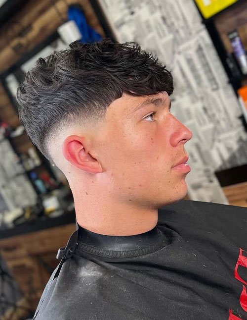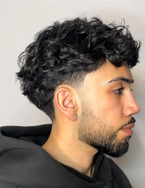 Designed for wavy hair, the taper fade keeps the sides gradually shorter while letting natural waves on top flow freely. It suits round, oval, and rectangular faces, elongating the profile subtly. Maintenance is medium, focused on keeping the fade clean and defining the waves with a diffuser or sea salt spray.