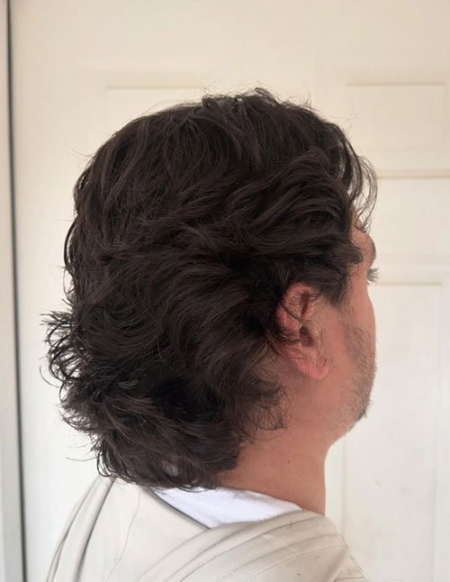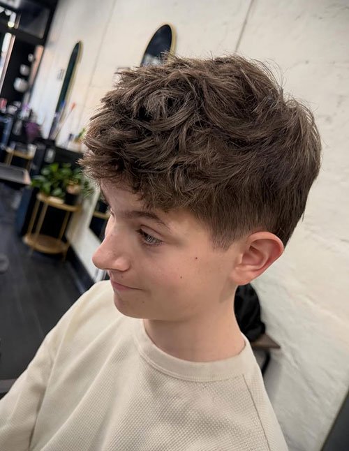 Wavy hair flows naturally over a gentle fade, creating seamless movement and soft volume. Ideal for medium to thick waves and oval or rectangular faces. Styling is low to medium, enhancing waves with a diffuser or sea salt spray.