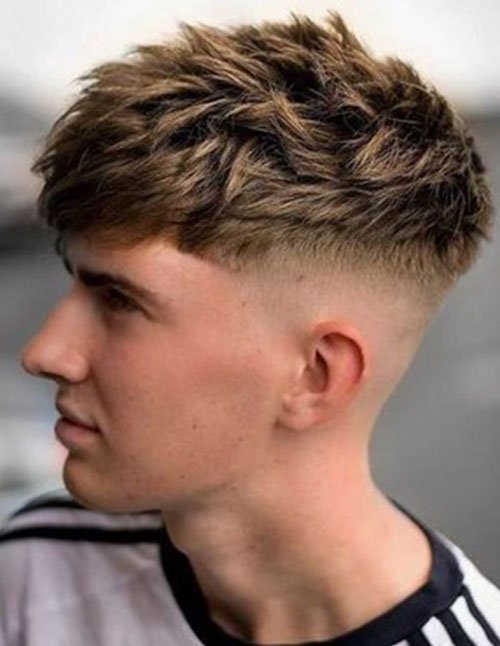 A textured crop fade pairs layered volume on top with a smooth taper on the sides. Thick or wavy hair benefits most, and the cut complements oval or square faces. Medium styling involves using paste or clay to emphasize texture.