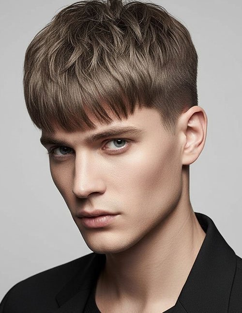 Short on top but layered for movement, the textured messy crop delivers a controlled, edgy appearance. Uneven layers create visual interest while the sides remain clean and balanced. It works best for straight to slightly wavy hair and suits round or oval faces.