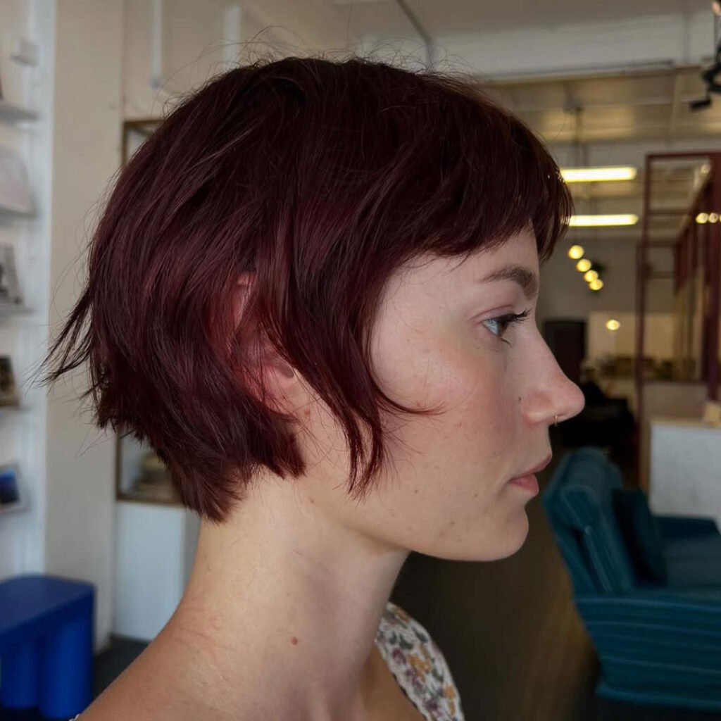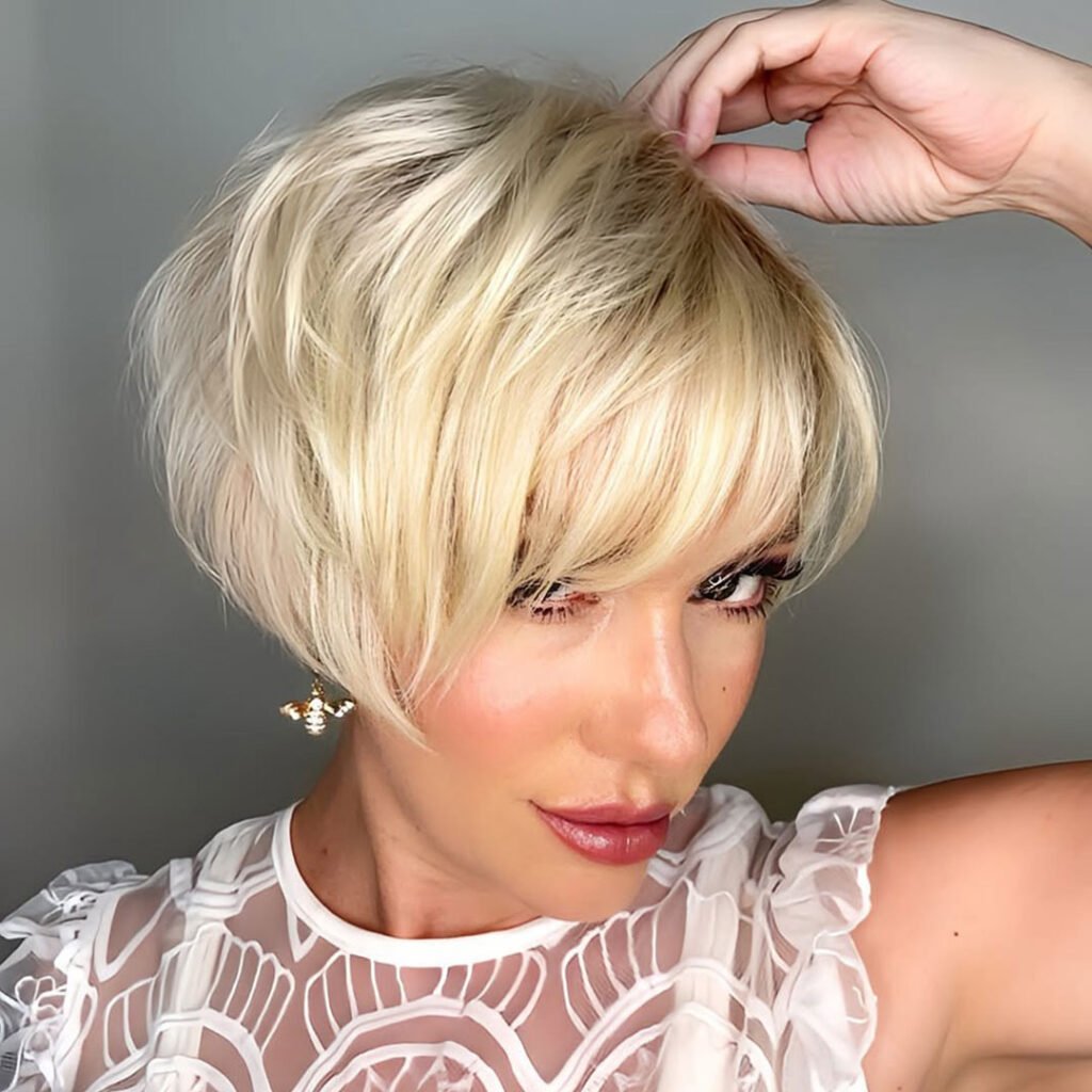 The short bangs give a sharp frame to the face, while the layers keep the hair light and voluminous. This cut suits adventurous individuals looking for a bold style.