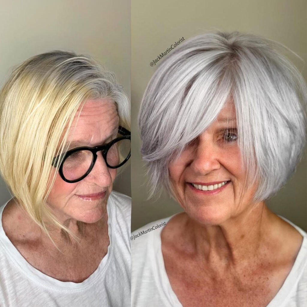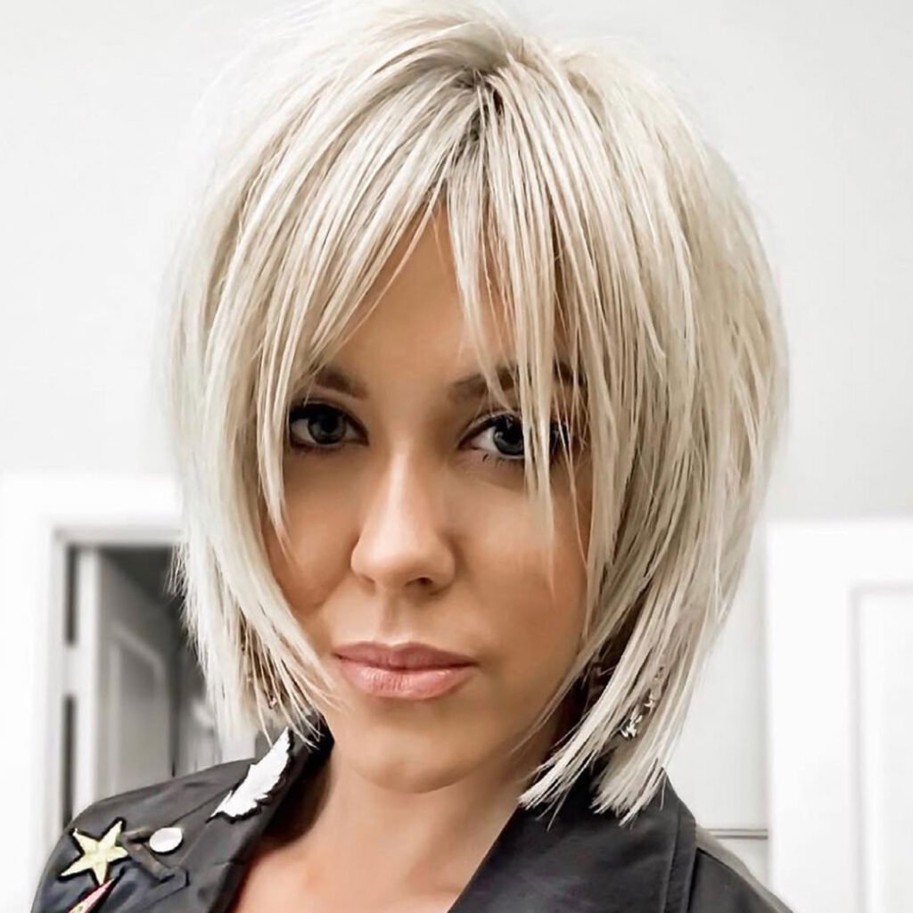 This style is ideal for medium to thick hair and suits those who want a bold, stylish haircut. The blonde shade brings brightness and dimension.