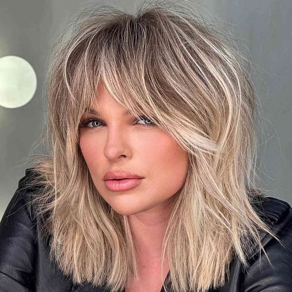 The blonde layered shag with bangs is a fresh and vibrant hairstyle that combines soft layers with bold bangs. The layers add movement and volume, while the bangs frame the face and soften the overall look.