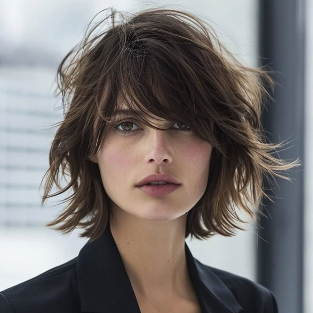 A textured shag with a messy fringe is perfect for those wanting a carefree, lived-in style. The messy fringe adds softness and frames the face, while the shag layers bring texture and volume throughout the hair.