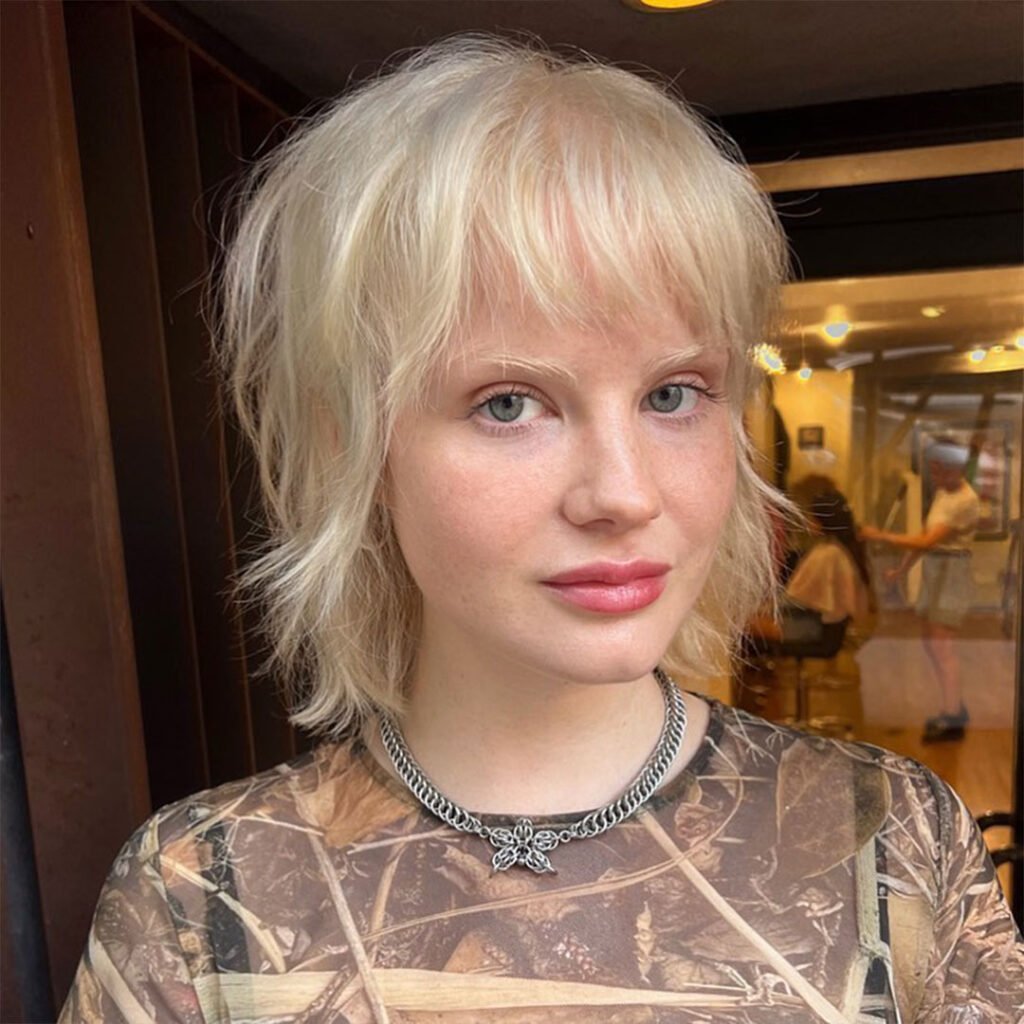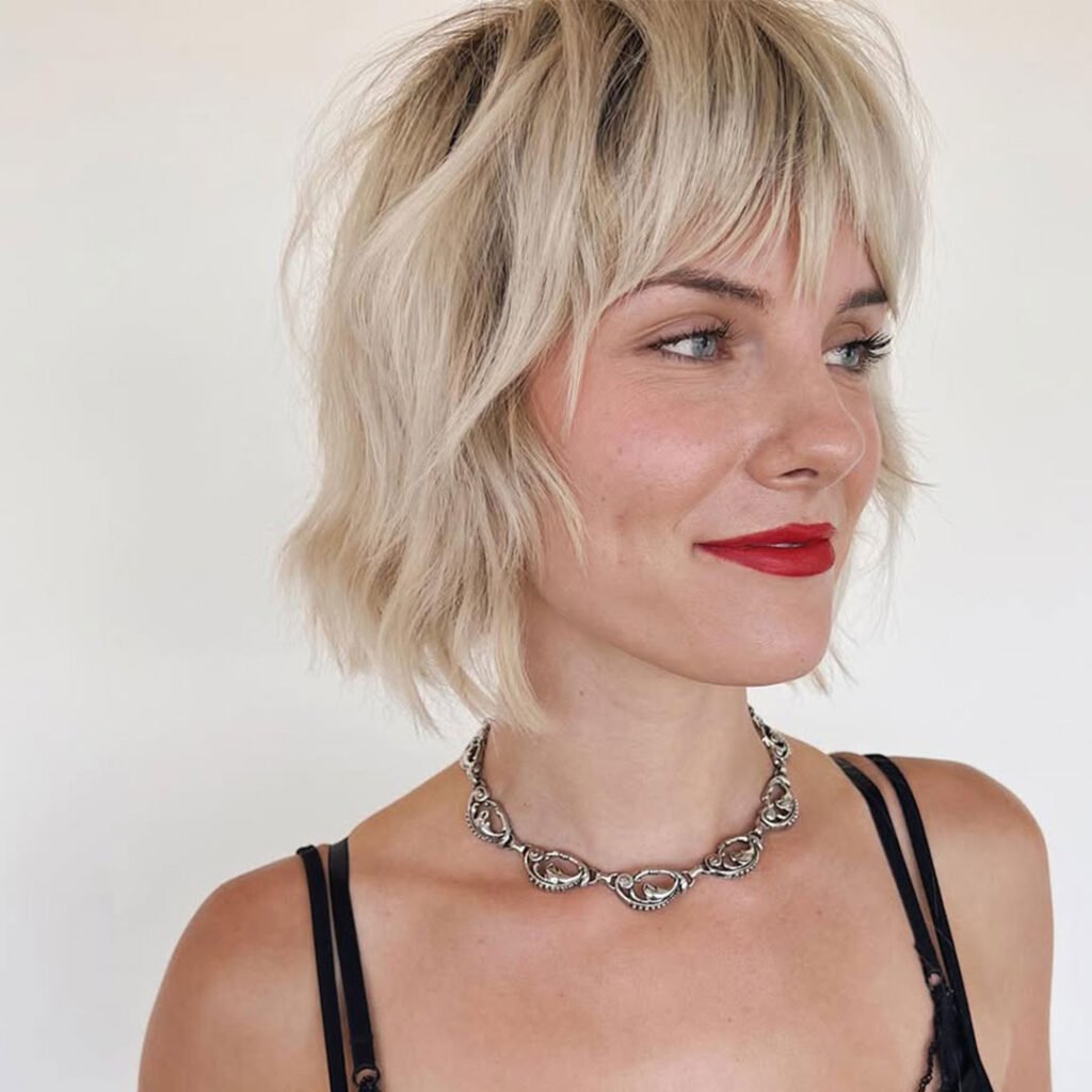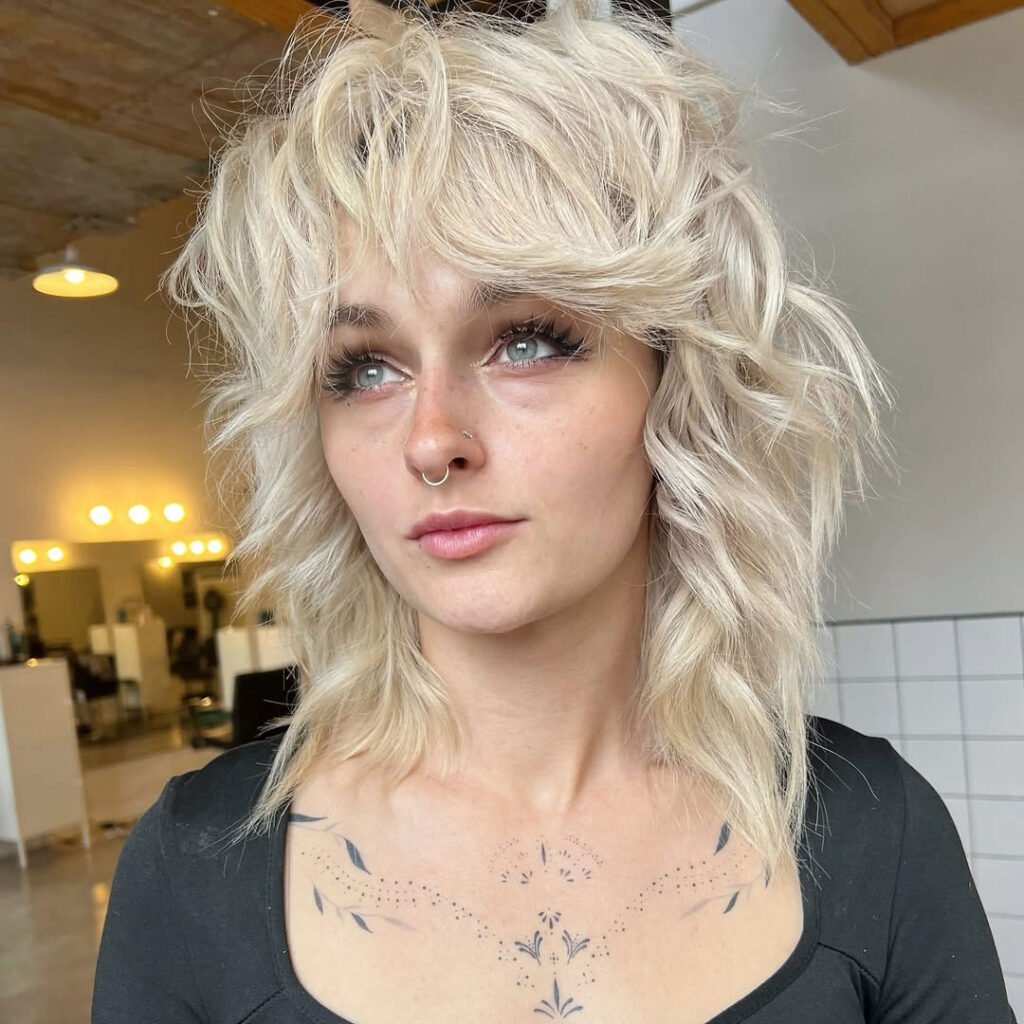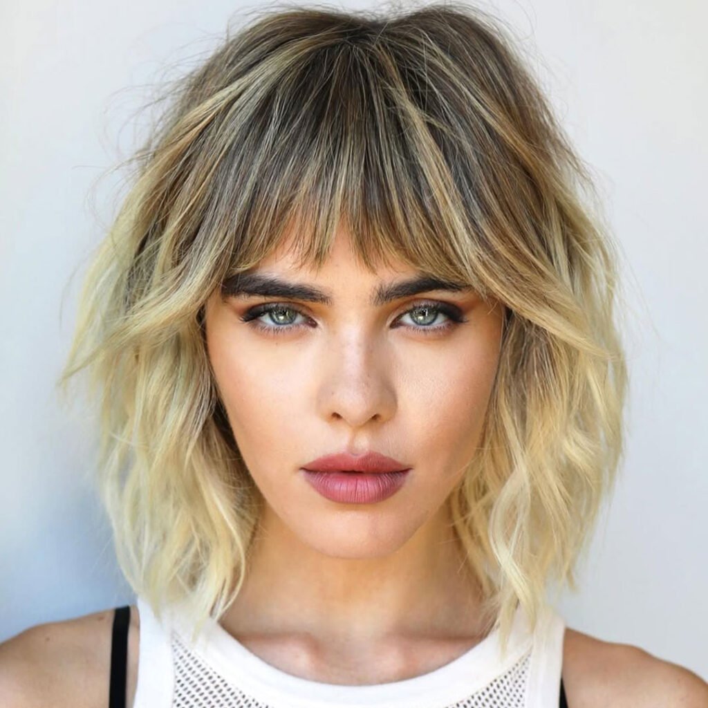 The blonde shag with heavy bangs offers a dramatic yet chic look. The heavy bangs draw attention to the eyes, while the shag layers add texture and fullness throughout the hair.