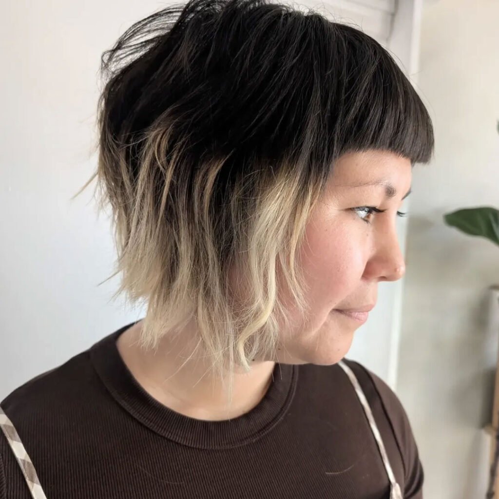 If you want a unique and eye-catching haircut, this two-tone shag with blunt bangs is a standout choice.