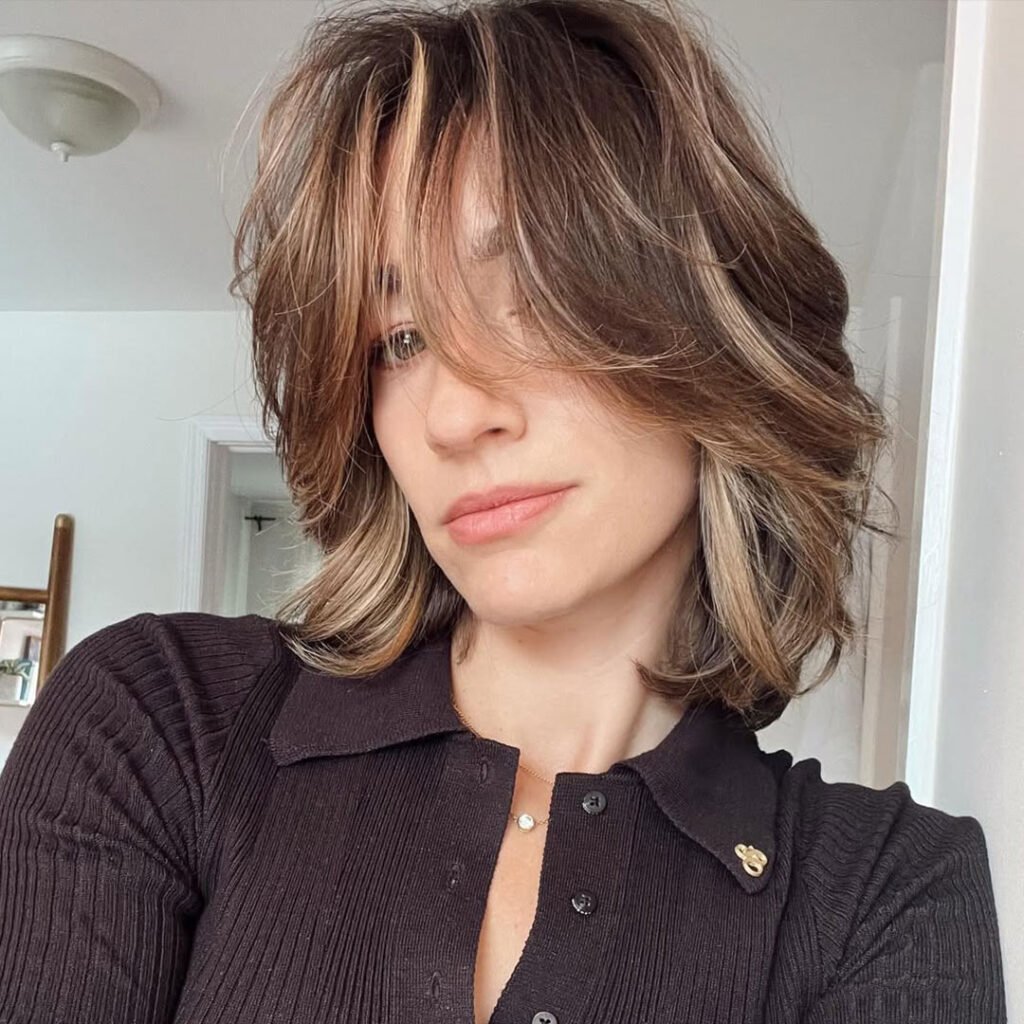 If you want a fresh look that’s full of life and personality, this shag with highlights and bangs is a great pick.