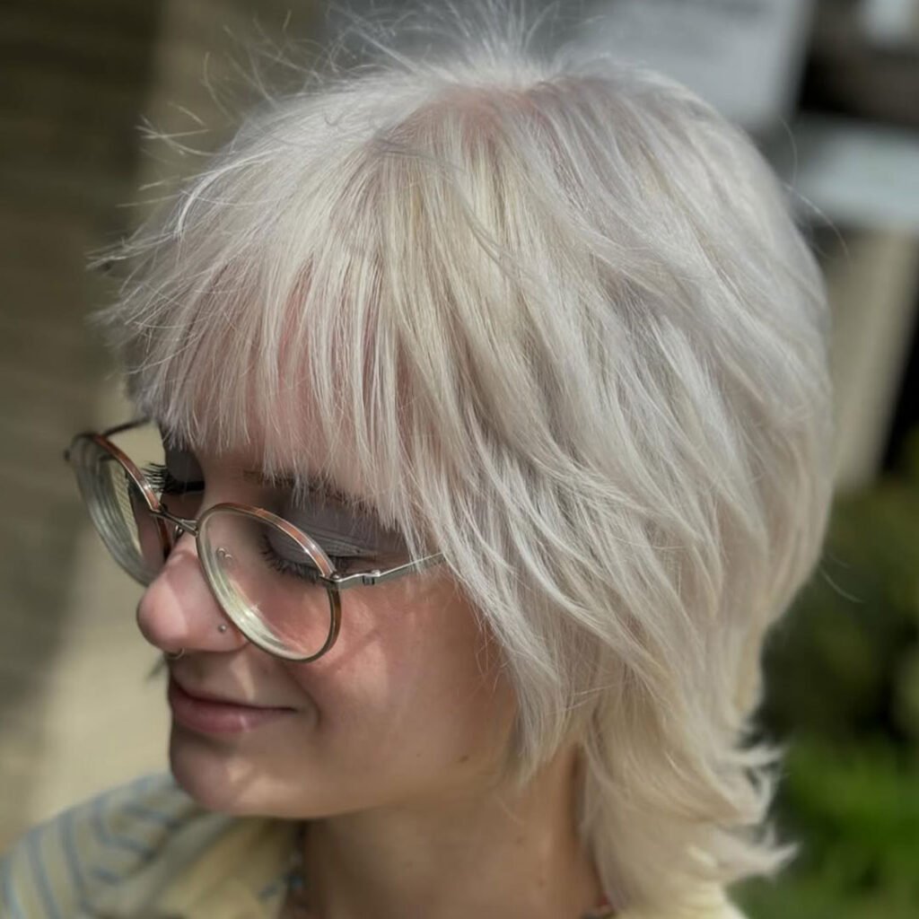 The silver blonde shag with bangs is a bold and modern hairstyle that stands out with its cool-toned color and layered texture. The bangs add a touch of mystery while blending seamlessly into the shag’s tousled layers. This haircut works wonderfully with medium to thick hair, adding softness and movement.