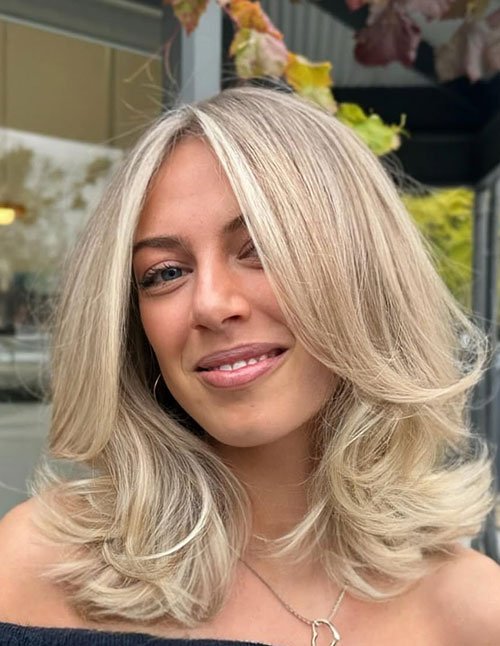 Maintenance is medium, but it grows out beautifully and stays flattering for weeks. Blow-dry with a round brush and flick the ends outward for that airy finish. The vibe is light, bouncy, and softly glamorous.