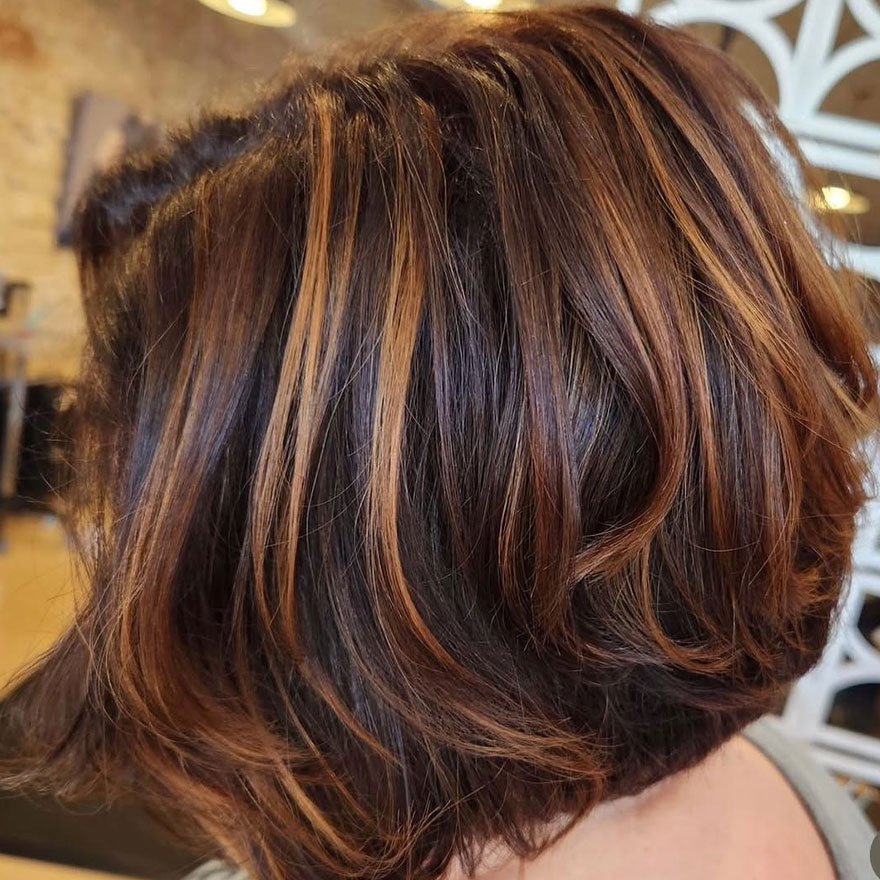 This elegant tone merges medium chestnut warmth with soft golden undertones, giving shorter styles like bobs a sophisticated, dimensional glow. Its balanced warmth enhances shine while maintaining a polished, natural finish that works perfectly in both casual and professional settings. The color complements sleek cuts by emphasizing movement and light reflection.