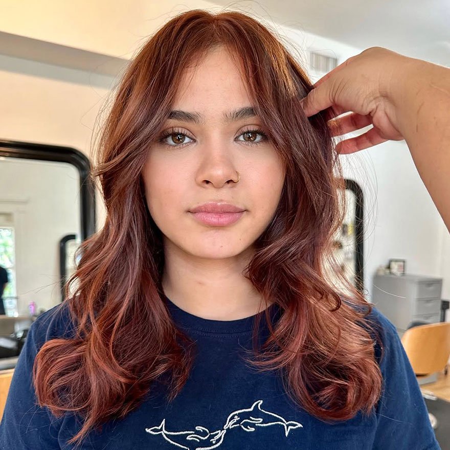 A fusion of earthy chestnut and fiery copper, this shade delivers multidimensional warmth with a playful retro edge. The color enhances hair texture, while curtain bangs frame the face and soften strong features. It’s ideal for those wanting a modern yet approachable way to experiment with red tones that retain natural depth and sheen.