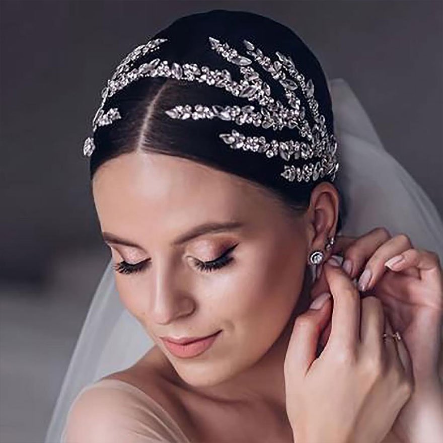 This accessory is especially versatile — it can be layered with veils, paired with statement earrings, or worn solo for a clean, polished bridal look.