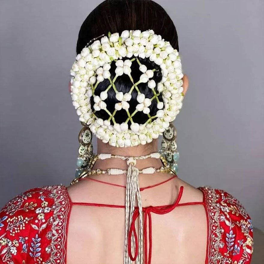 The full floral gajra bun cover is a showstopping choice for brides who want to embrace natural beauty. Made with fresh blooms like roses or jasmine, it creates a complete circle of flowers that instantly transforms a simple bun into a regal statement.