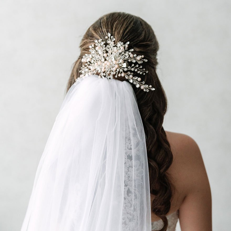 The pearl and crystal bridal comb is ideal for brides who love subtle sparkle paired with classic charm. It sits seamlessly under a veil, securing it in place while adding soft radiance to any updo or half-up hairstyle. The combination of pearls and crystals enhances both modern and traditional gowns with equal grace.