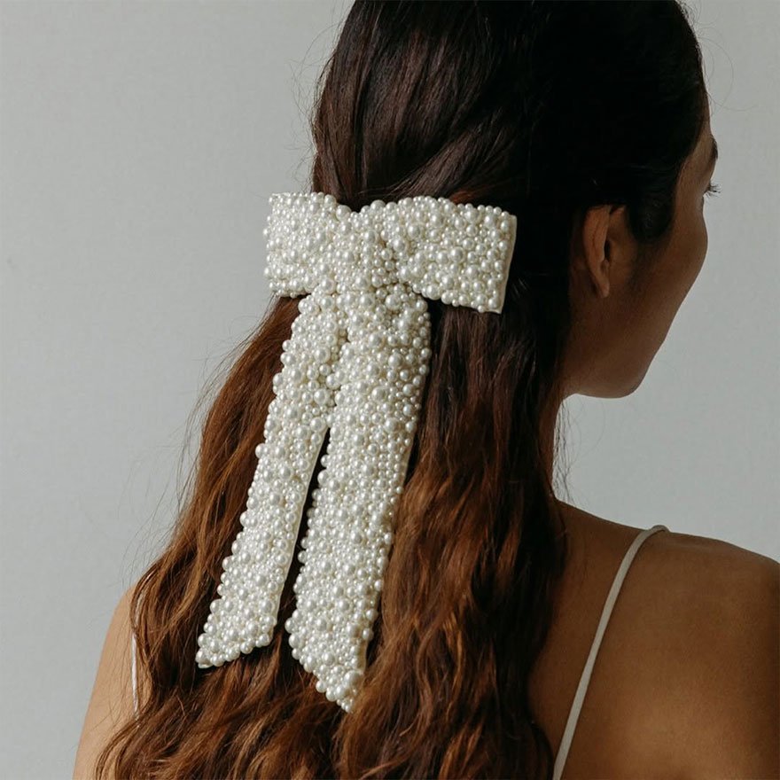 The pearlcore bow clip is a modern favorite that blends playful femininity with timeless sophistication. It works perfectly with ponytails, half-up curls, or low buns, giving a polished yet youthful bridal touch. Brides who want something trendy but elegant will adore this chic piece.