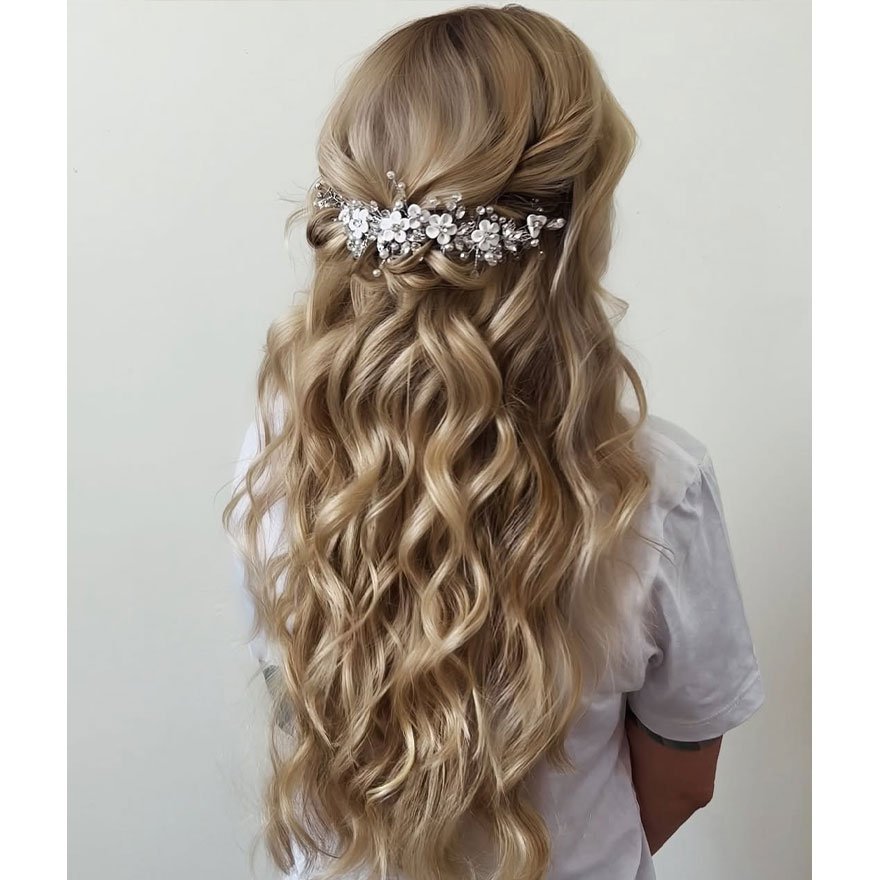 Decide how you plan to wear your hair — up, down, or half-up. Knowing your hairstyle helps narrow down which accessories will enhance the look instead of overpowering it. - Consider the Veil (If You’re Wearing One)