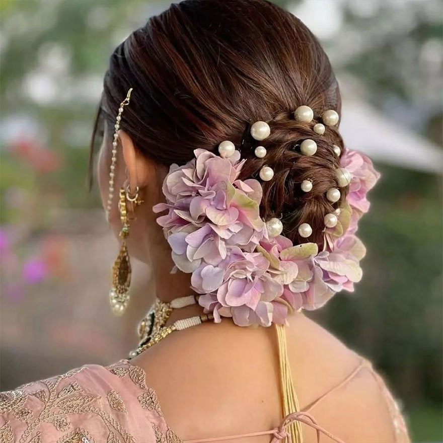 The fresh floral gajra is a traditional yet timeless choice, symbolizing purity and grace. It beautifully wraps around buns or braided updos, adding color, fragrance, and authenticity to bridal hairstyles. Especially loved in South Asian weddings, it pairs naturally with both sarees and lehengas.